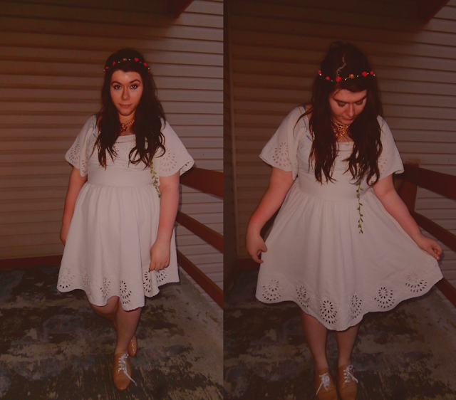 Its the first white dress I've ever owned, and I love it. The eyelet details are so innocent. I like the 60s vibe, so I paired he dress with my floral crown from eBay and my thrifted oxfords/