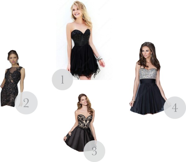And, #4 is a strapless sweetheart neckline dress with a glittery silver bodice and black chiffon skirt, for a more casual yet chic dress.