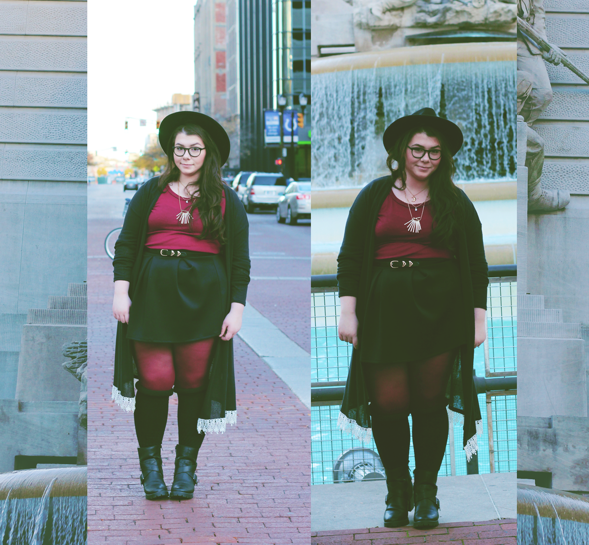 I love the color red and variations of it. I don't wear a lot of red, but I still love it. Wine/burgundy is my favorite variation, and I love love love these tights. These are from Target from last year, and they're the perfect mix between sheer and opaque. I like the coordination and separation of colors, with the black of the skirt and the socks breaking up the wine. Definitely a fall appropriate outfit!