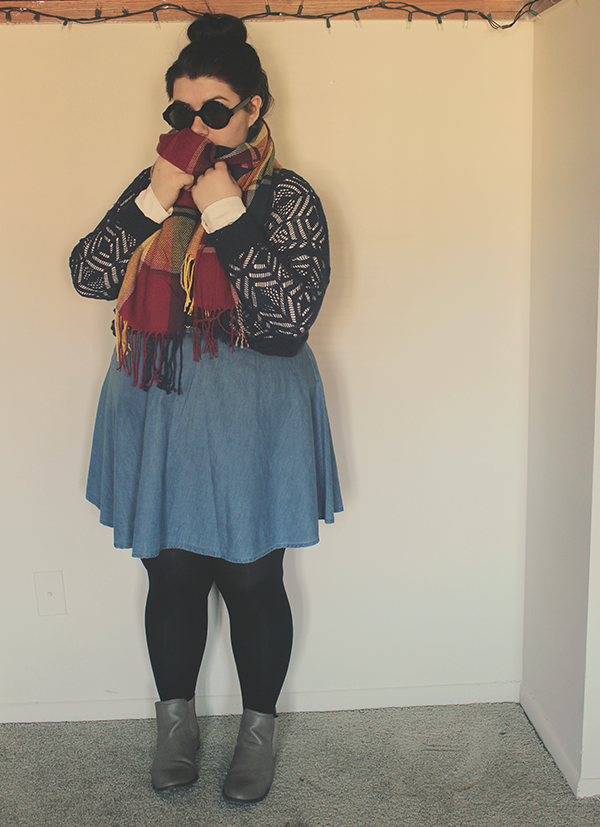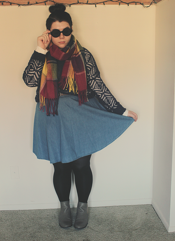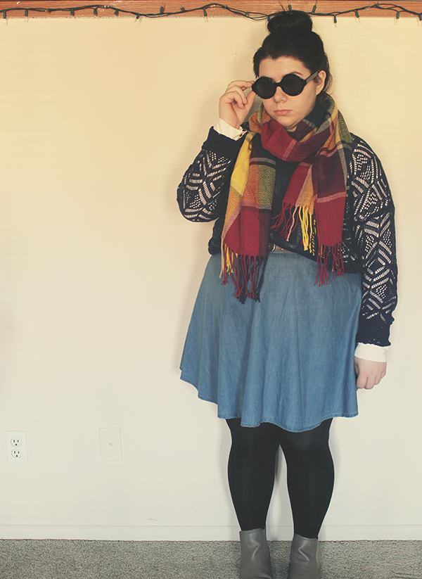 I had to wear these things immediately, I mean, it's cold and bright and I couldn't help myself! Since it is pretty dang chilly out, I layered a sweater over a collared blouse, and tights under a chambray skirt, then chucked on my new scarf and sunglasses.
