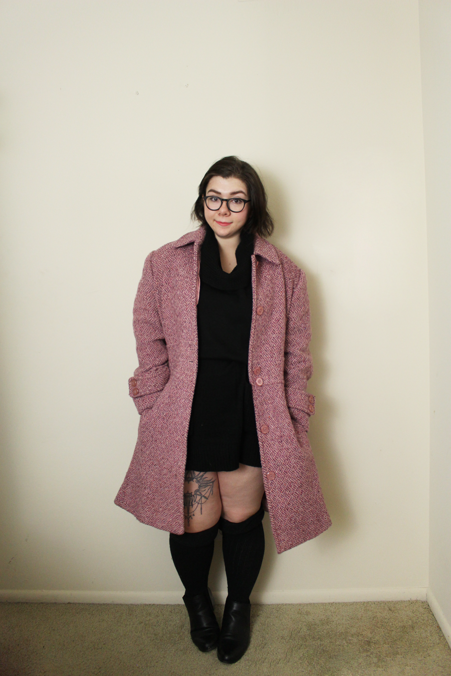 Coat--Thrift (similar) / Sweater Dress--Meijer (similar) / Ankle Boots-- (similar) / Hat--Forever 21(similar)