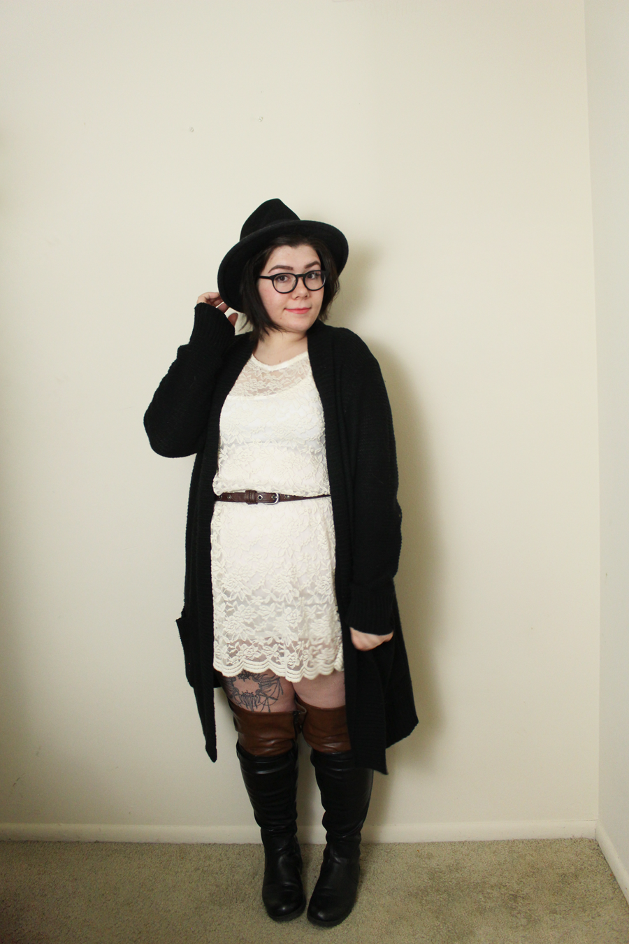 Dress--Thrift (similar) / Cardigan--Thrift (similar) / Boots--Thrift (similar) / Hat--Forever 21 (similar)