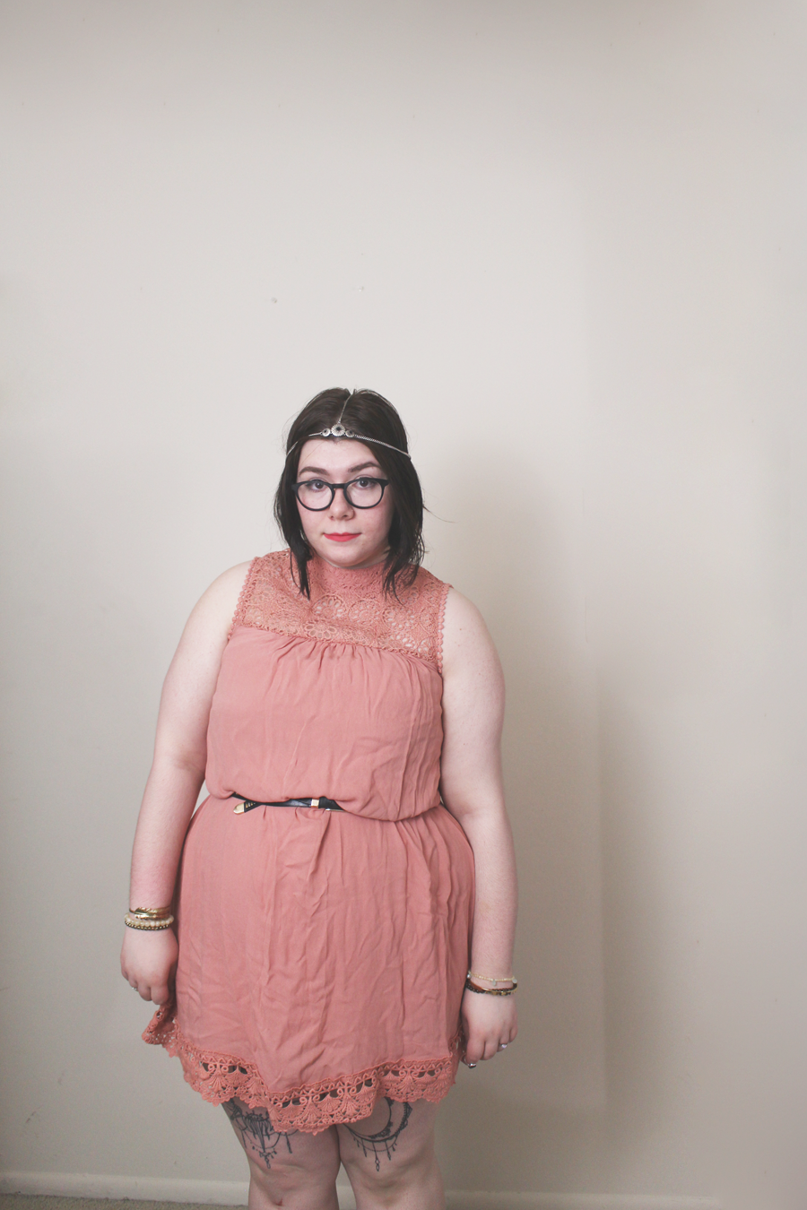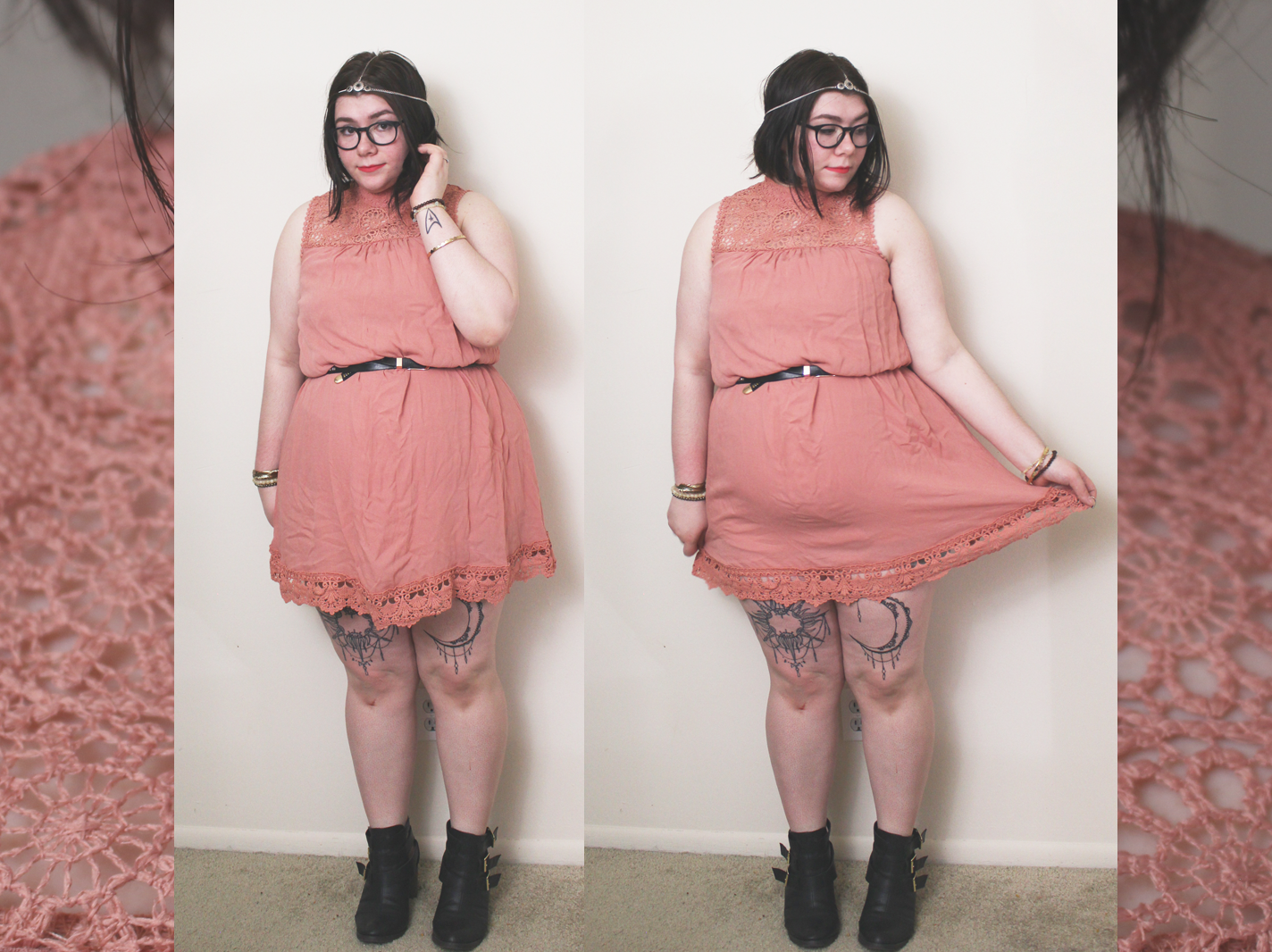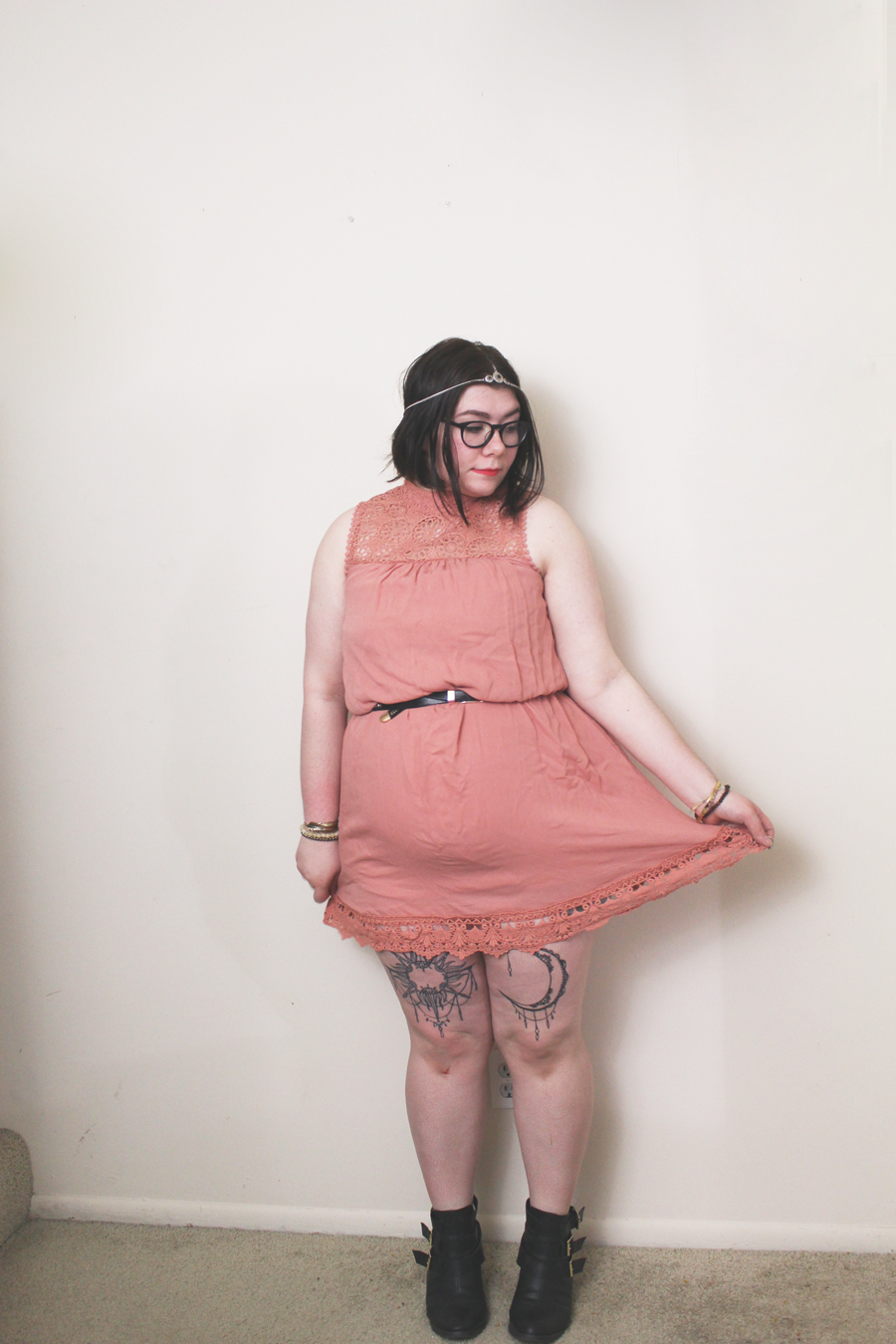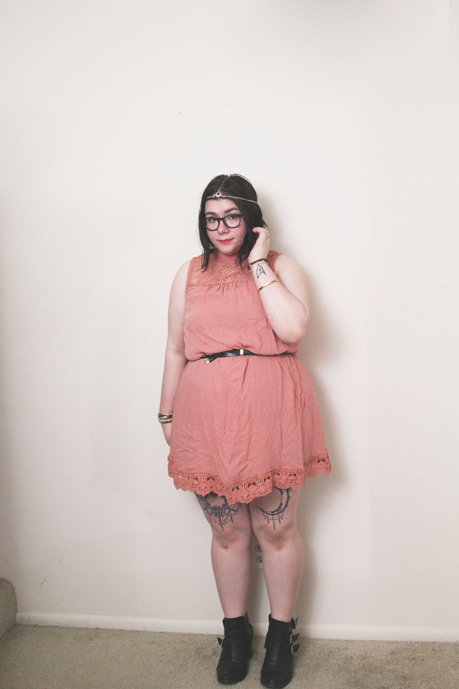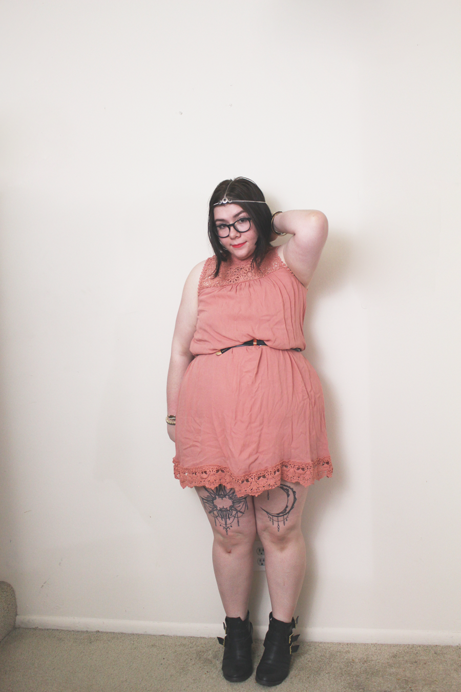 I belted the dress to define my waist, though the dress is naturally a shift dress. I am in love with the color and it's like an ashy rose quartz. It's pretty perfect for Spring and Summer. With the addition of a head chain and some heeled booties, this boho inspired look is fantastic for a day outdoors!