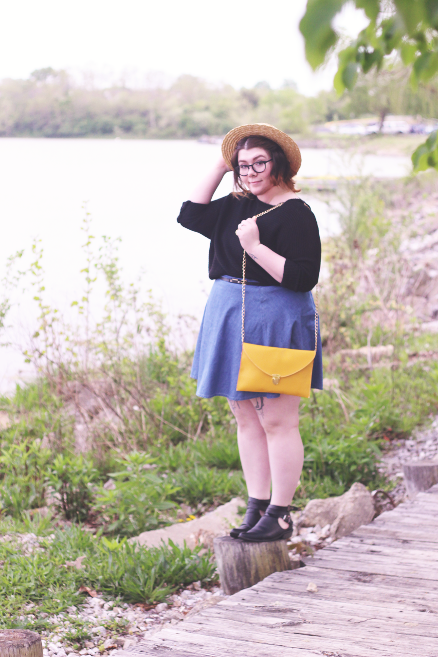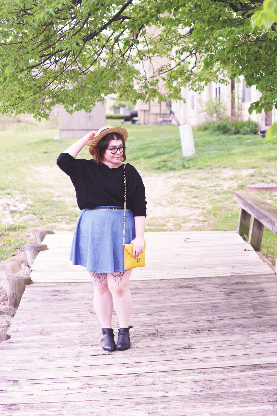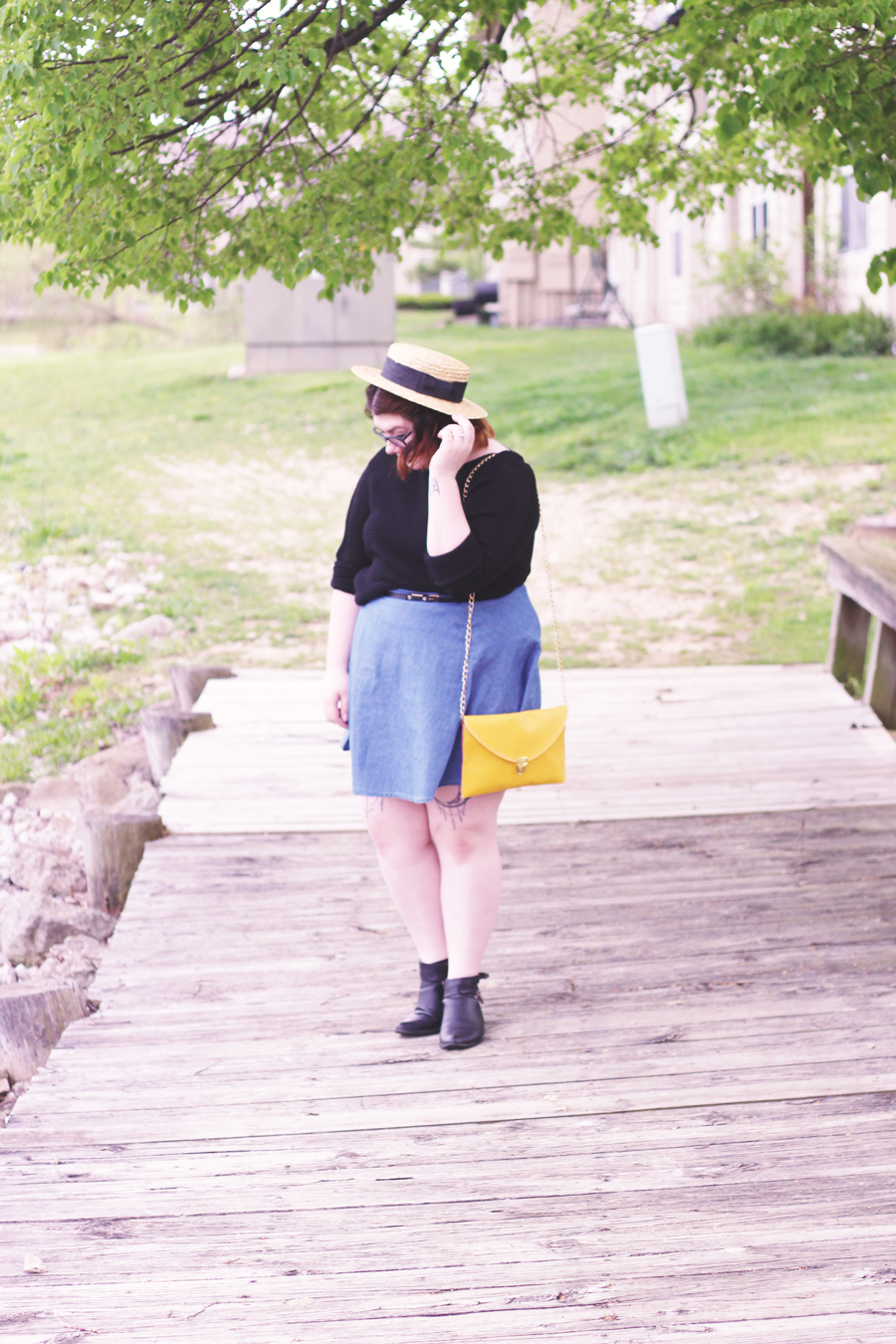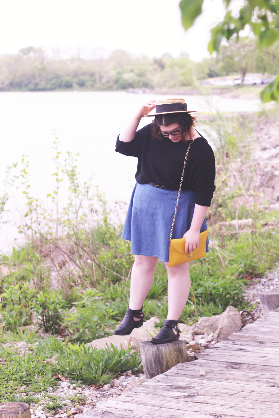 Mixing seasonal items, like sweaters and boater hats, can make for a really interesting outfit. I don't think I'd ever mix a coat with flip flops, but sandals and jeans, or cardigans and shorts I could do. I paired the sweater with a lightweight chambray skirt from Forever 21 and a pair of cut out buckle boots. With the addition of a thrifted straw boater hat and an envelope crossbody, this outfit was perfect for a burger lunch outside and cloudy drive around the city.