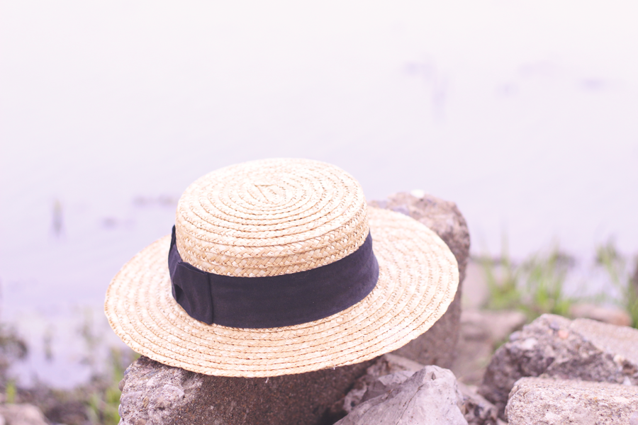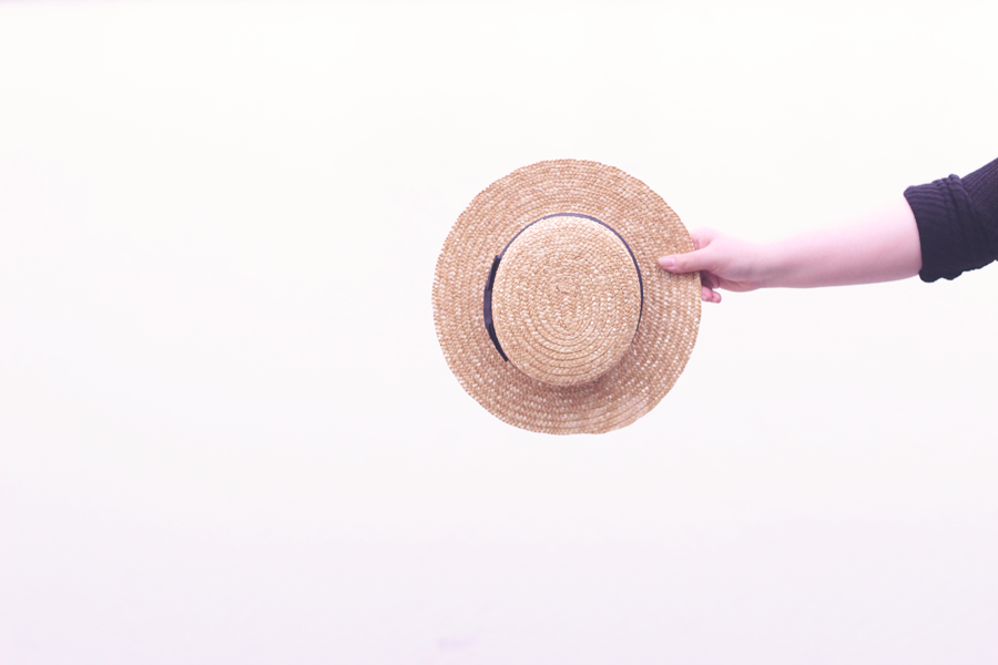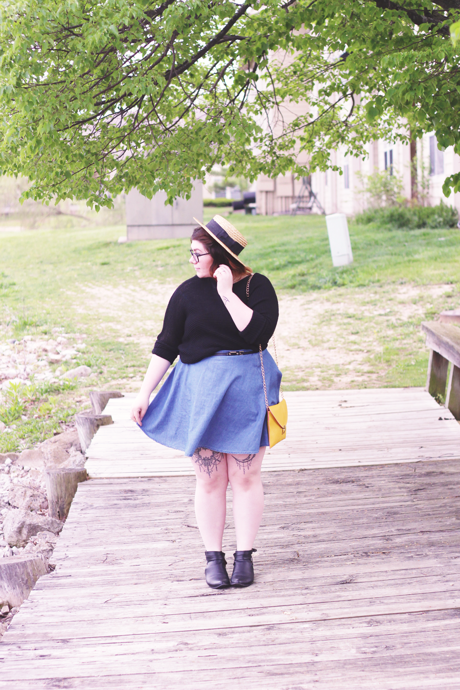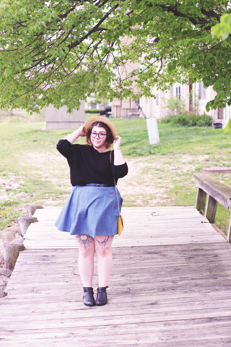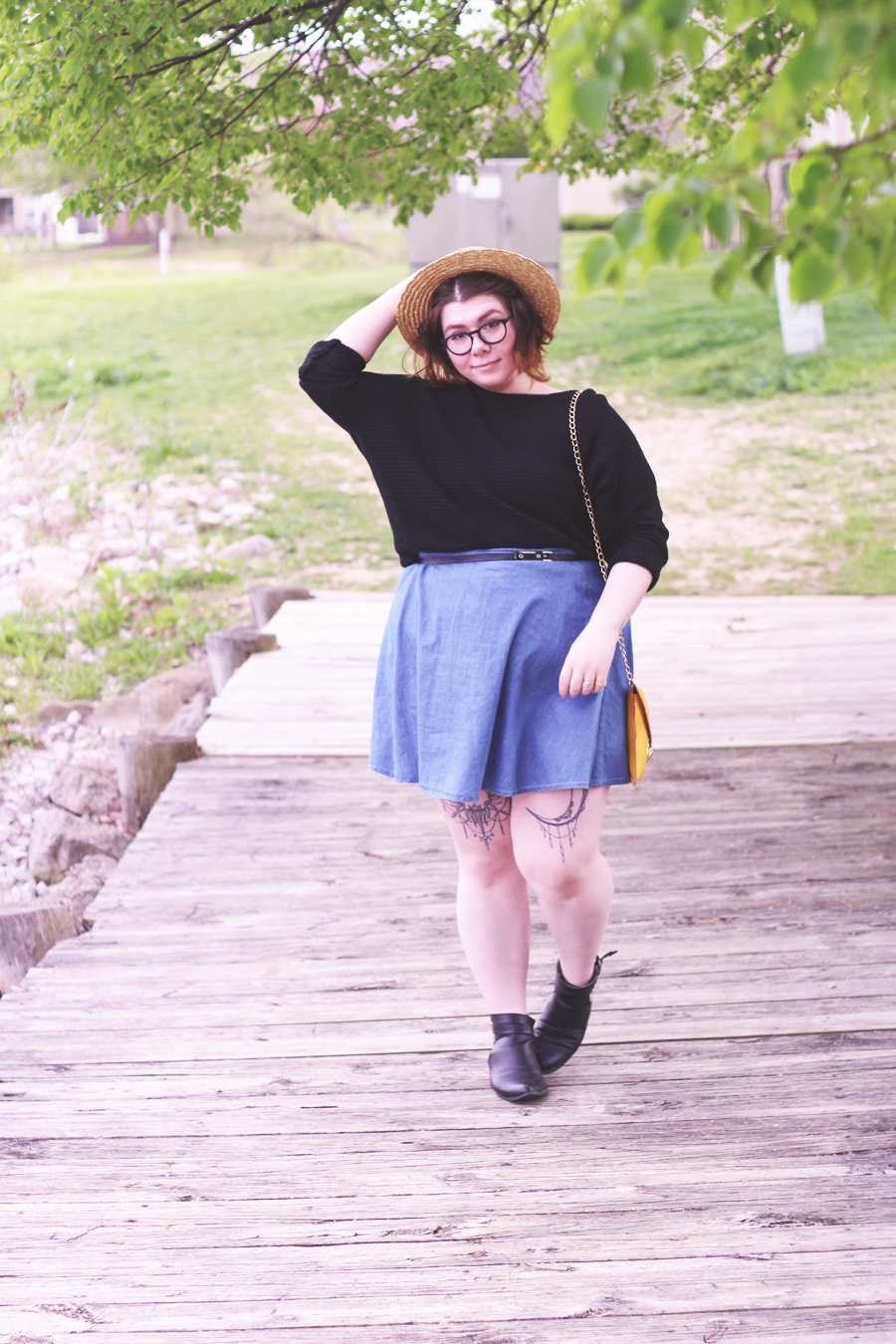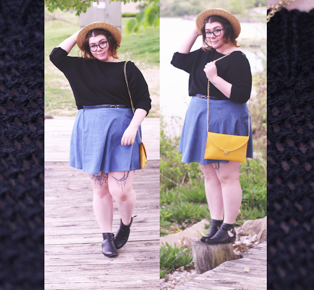Mixing seasonal items, like sweaters and boater hats, can make for a really interesting outfit. I don't think I'd ever mix a coat with flip flops, but sandals and jeans, or cardigans and shorts I could do. I paired the sweater with a lightweight chambray skirt from Forever 21 and a pair of cut out buckle boots. With the addition of a thrifted straw boater hat and an envelope crossbody, this outfit was perfect for a burger lunch outside and cloudy drive around the city.