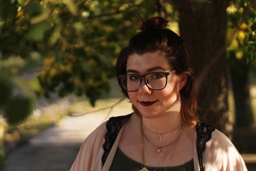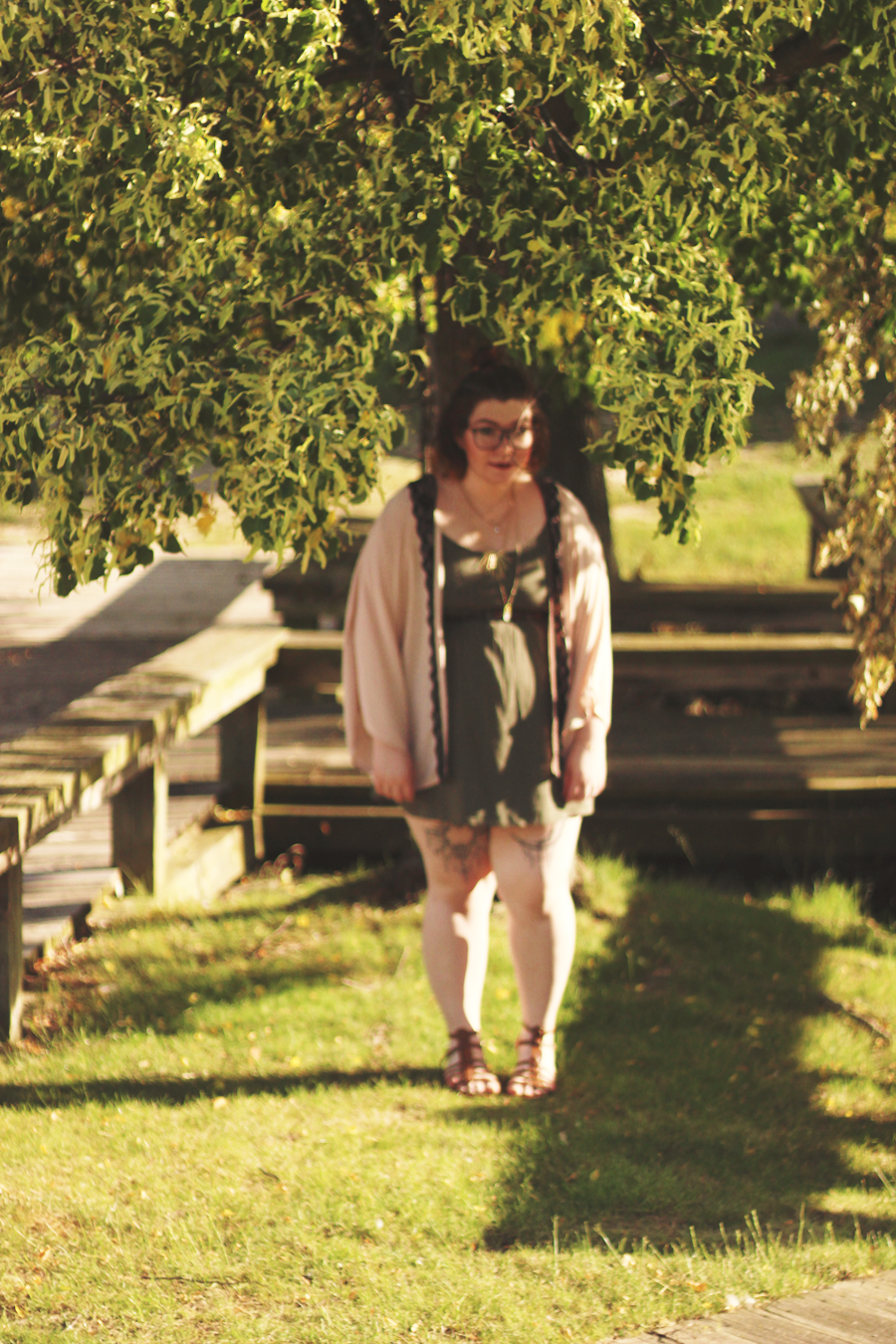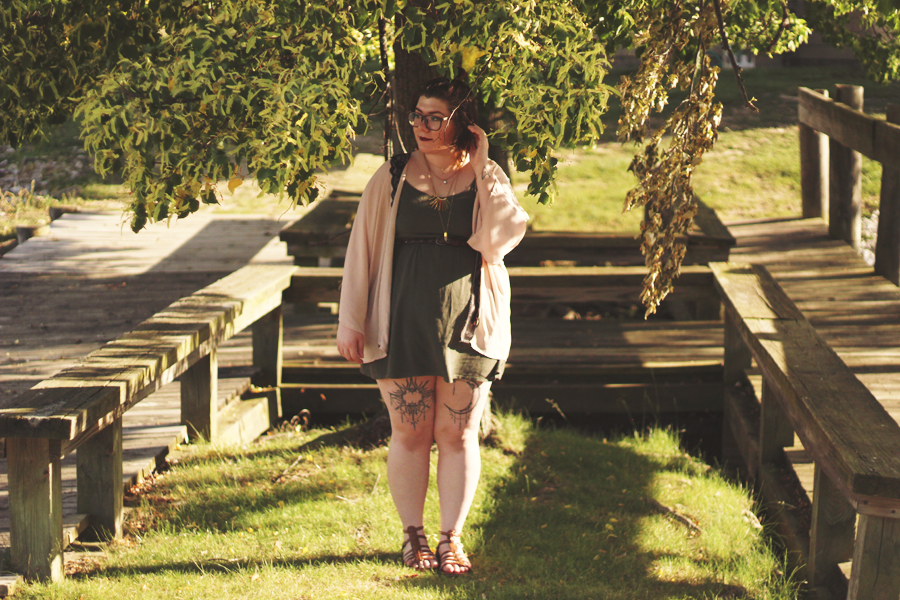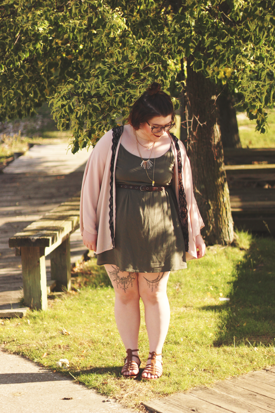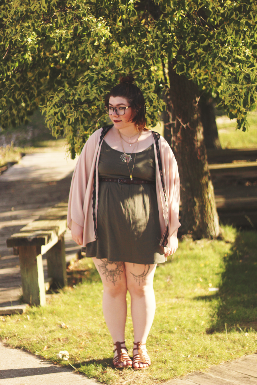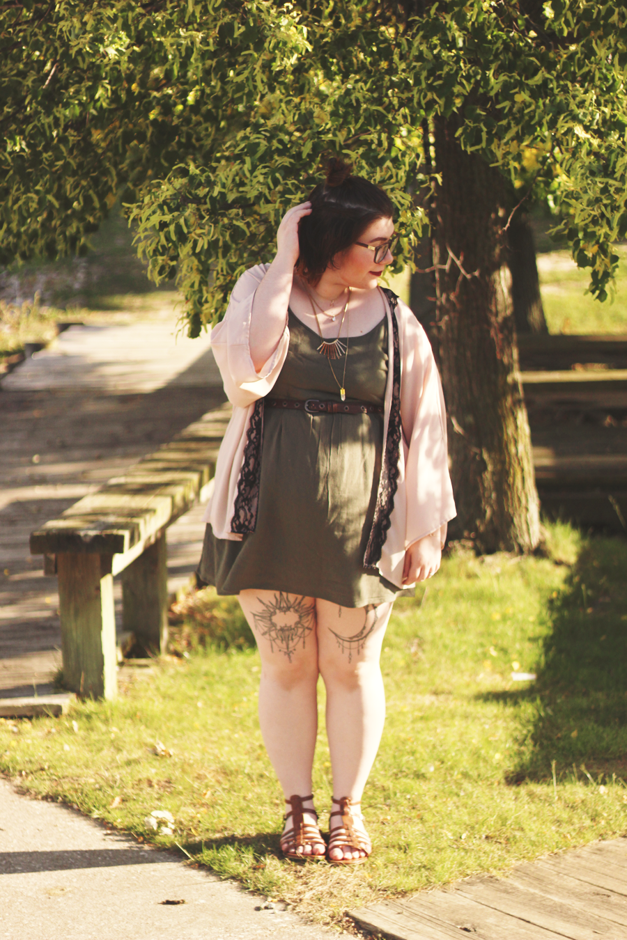 I paired this olive green dress from Forever 21 with this thrifted pale pink kimono for some visual interest and sun protection. I doubted that olive green and pink look together before I tried this, but I have to tell you, I'm sold on this color combo. I added some long layering necklaces, a simple bracelet, threw my hair in a hipster bun and swiped on some dark lipstick. I don't know if I have the face and hair to pull off a hipster bun, because my hair is at an awkward length, plus one side of my hair is shorter than the other because I'm growing out an undercut. What do you guys think?