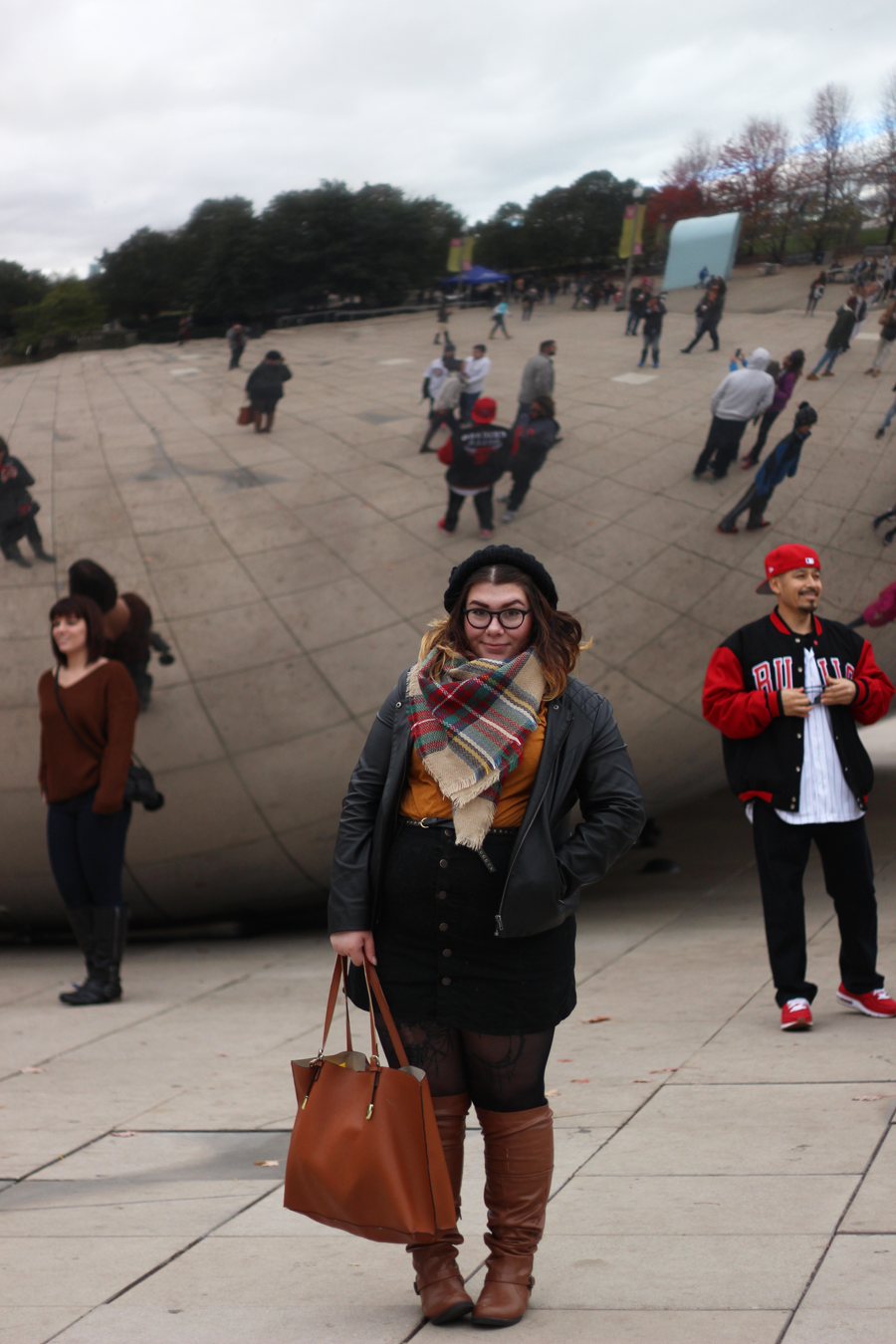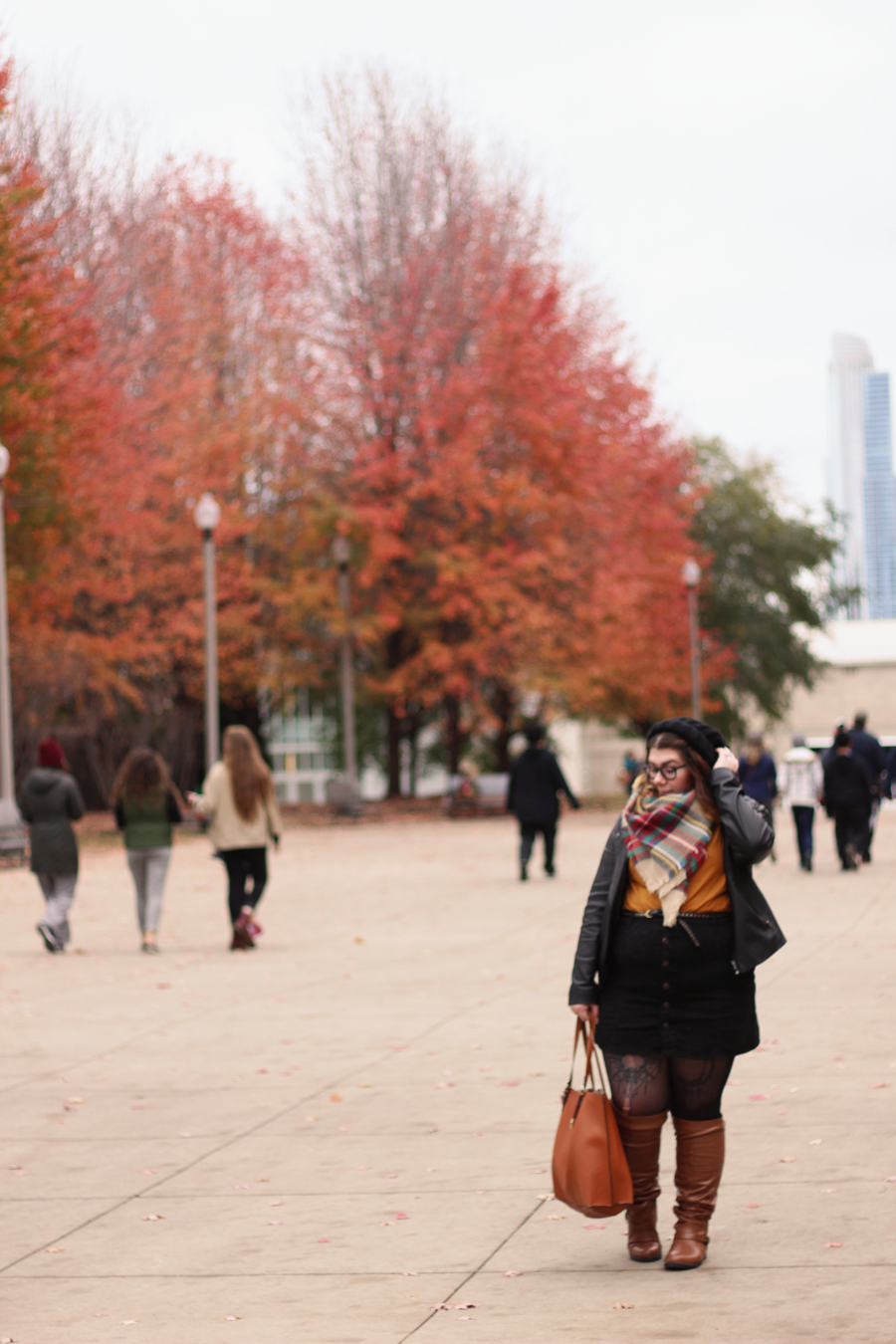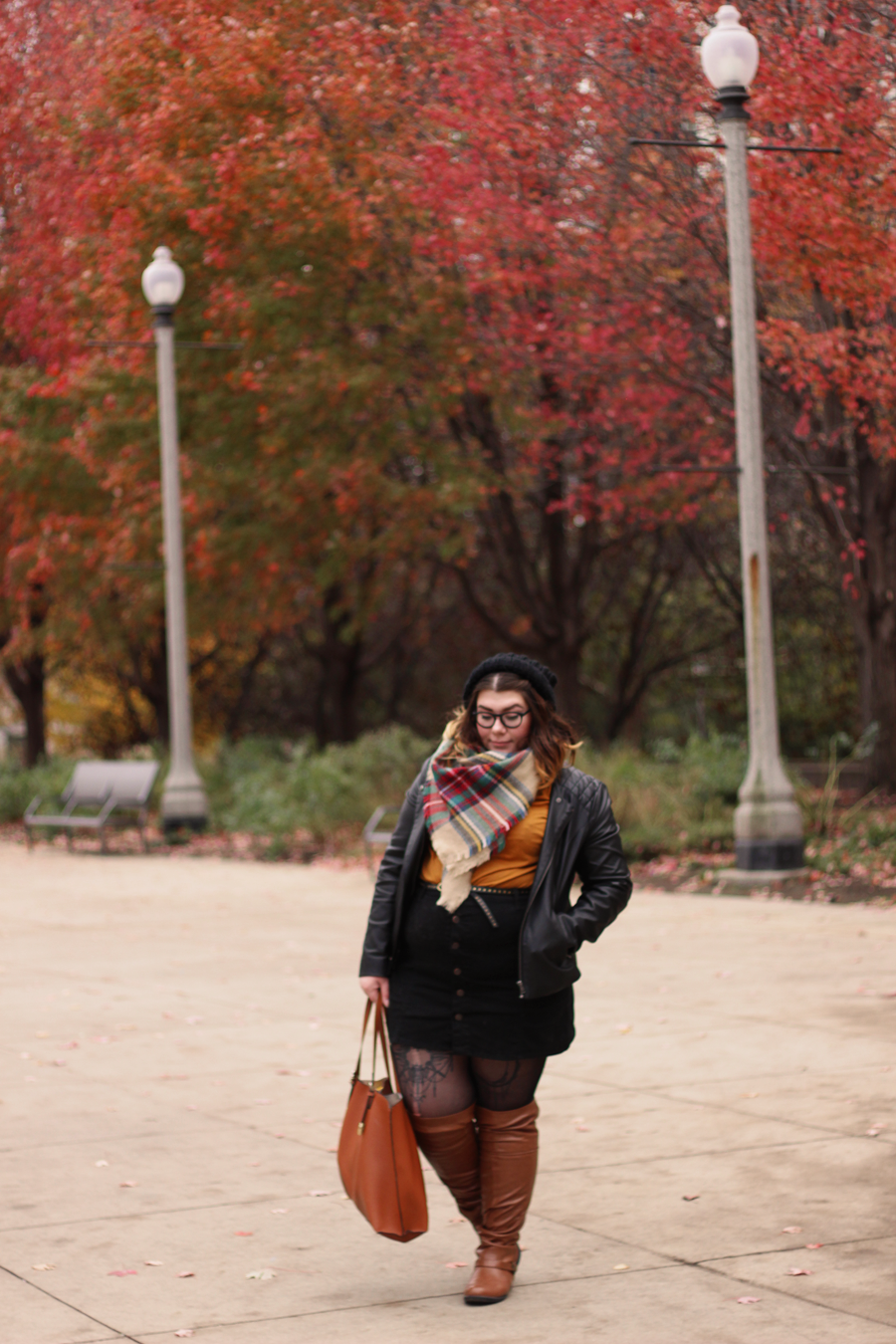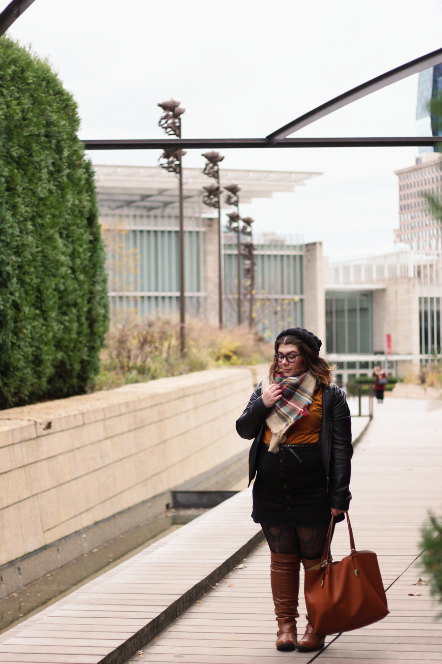 The reasoning behind this outfit was that I wanted to wear these newly received over-the-knee boots that did not stay over the knee throughout the day. I wanted to play with the brown by pairing it with mustard and plaid, so I did that and added some black for balance and as a neutral. My tights got a run somehow between walking out of a parking garage and walking to the park, so enjoy, as it was unintentional and too damn cold to go without.