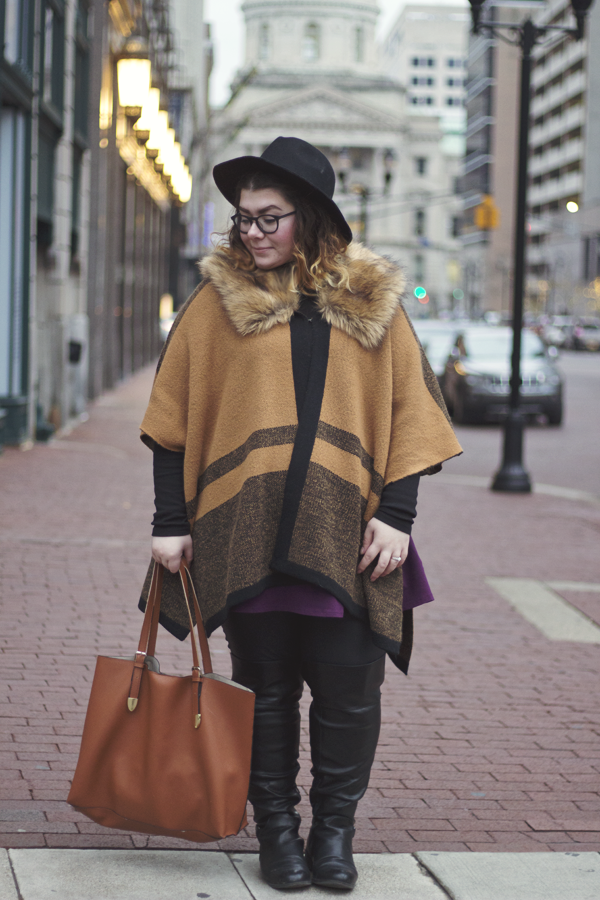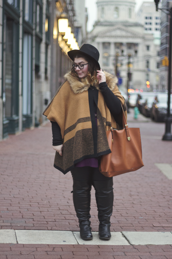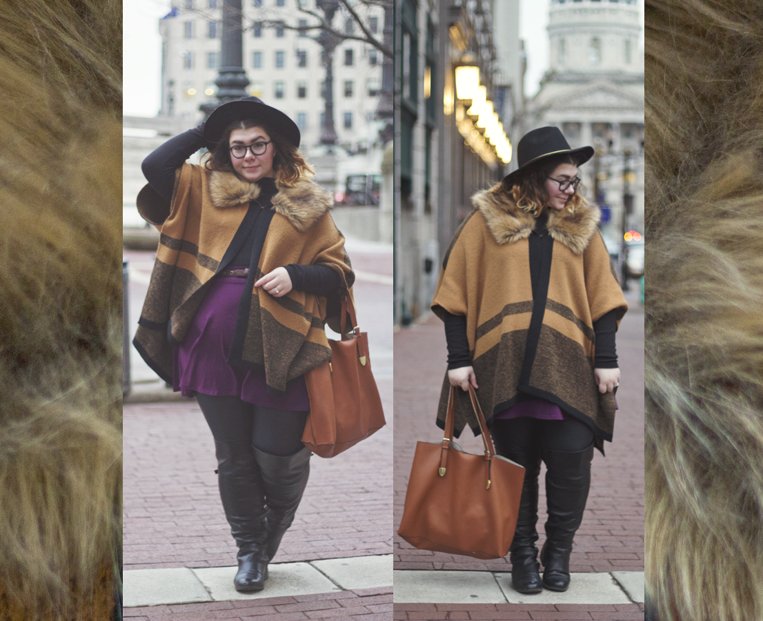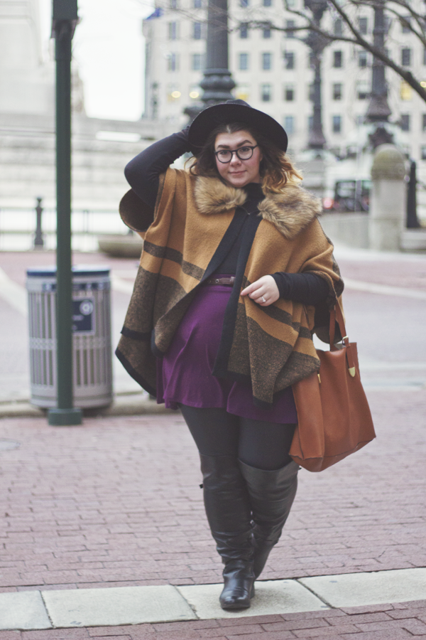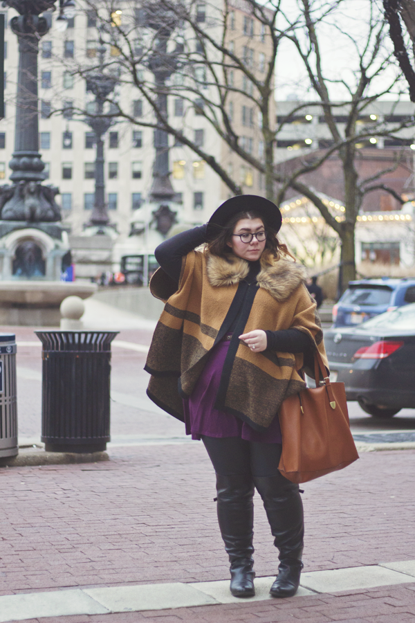 I picked this shawl (that I'm calling a cape. seeing as it has sleeves and a closure) from Forever 21 a few weeks ago and it immediately got warm once I did. I waited patiently until the temperatures dropped before I styled it, as to not torture myself. I love brown and jewel tones together, so I donned the cape over a basic mockneck top from H&M and an old skater skirt. I really wanted to make the cape the focal point of the outfit. so I kept the rest of the outfit pretty basic, with a black hat and black over the knee boots.