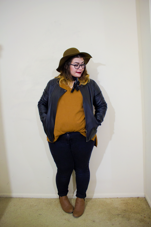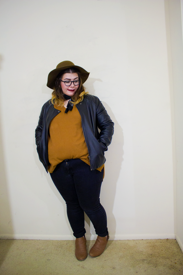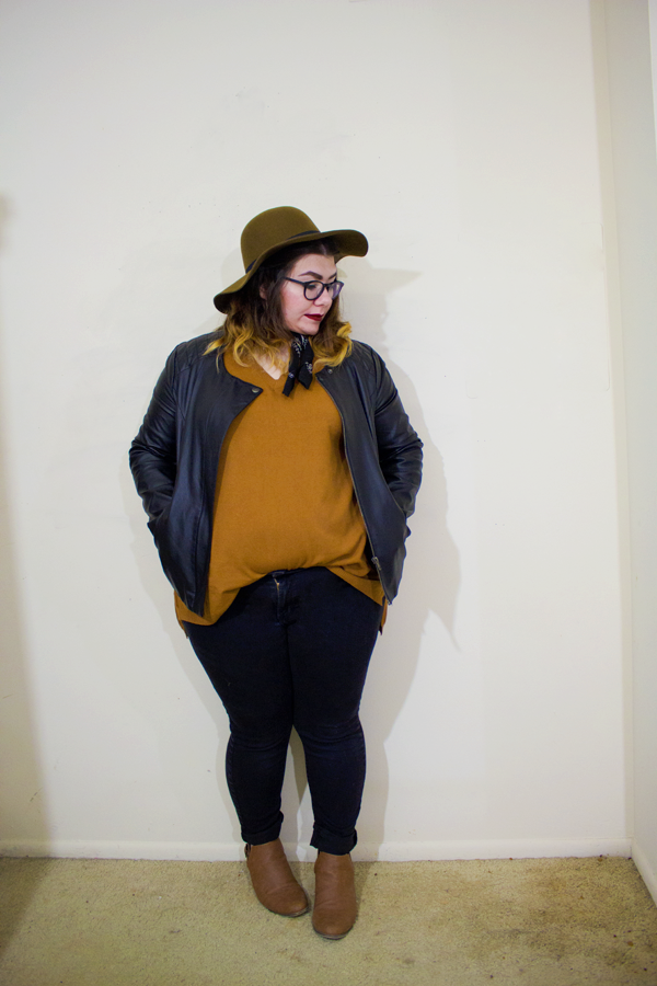 Passing up a good sweater is a sin in my book, so I had to grab this lightweight v neck one from Charlotte Russe. The mannequin had it styled in the most Katie like way ever, so I caved, plus, it was on sale. So score for me. I tucked the mustard baby into a pair of mid rise thrifted black jeans and layered a faux leather jacket atop for some warmth and edge.