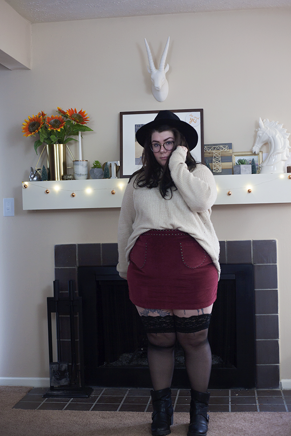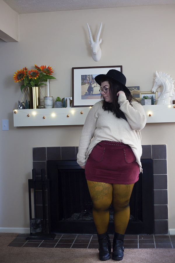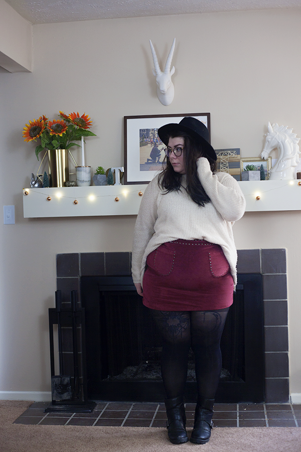 So, because it is getting colder outside (we have snow on the ground!) and my skirt love shows no sign of stopping, I wanted to showcase an outfit that you could wear right now that is going to keep you warm and stylish, even if you have snow on the ground. For the main outfit, I have an old cream sweater half tucked in to this cute studded faux. suede mini skirt. This outfit begs for some sort of legwear for balance, as the legs are bare as the top is covered.