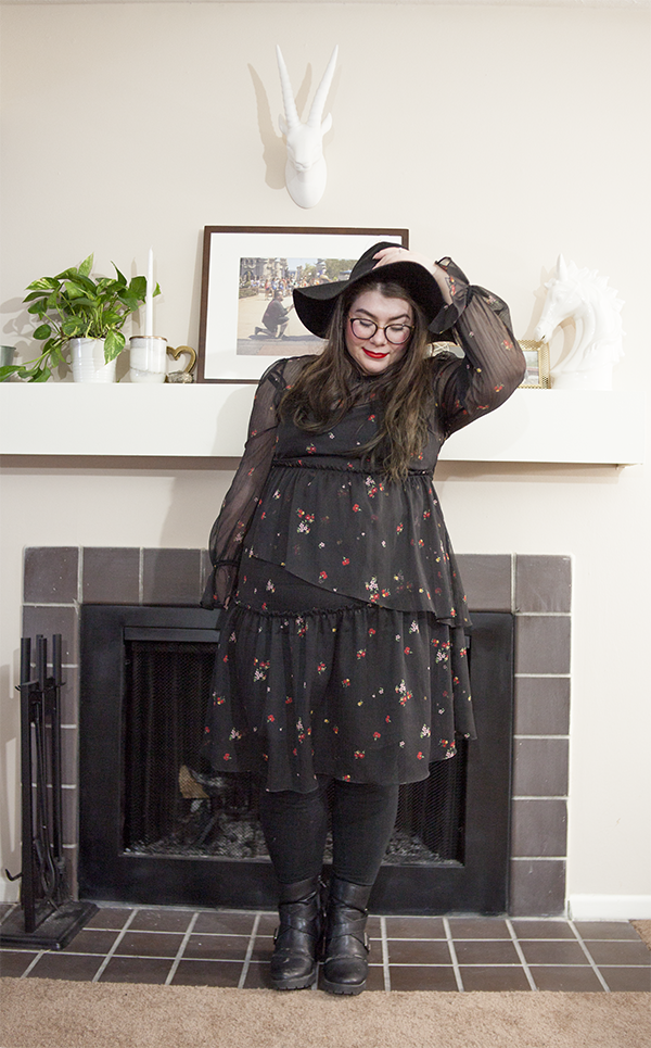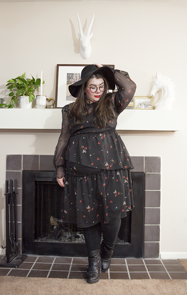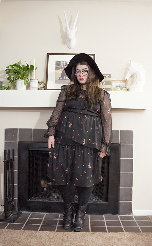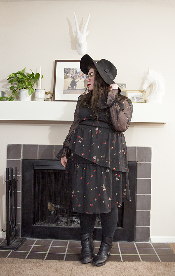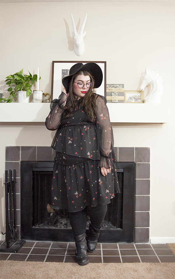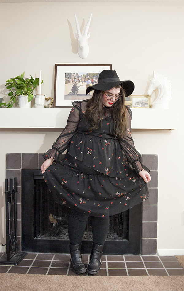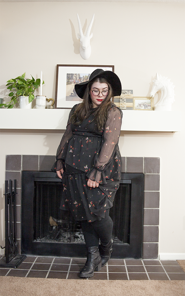 This dress was a birthday gift from Tony to me and I adore it. He saw me looking at it in the store because I love the micro floral print and the sleeves and knew it was my style. I decided to style it in a late winter witch way. But, I can totally see it being styled in a sweet romantic way.