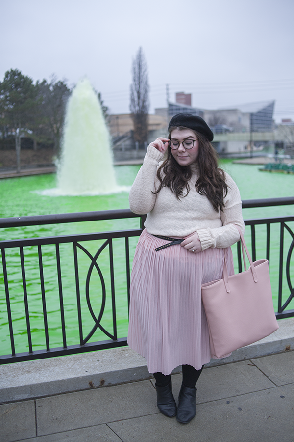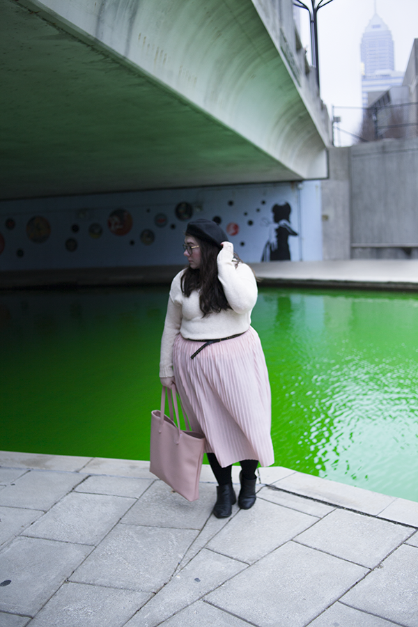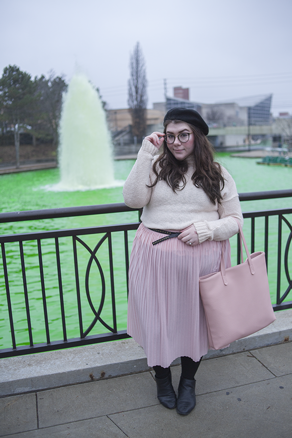 I don't think I've ever been the kind of person who hated pink. Okay, maybe in everyone's emo days they claimed they didn't like it, but I really do like pastel shades of pink. Millennial pink (ugh) has to be the most gorgeous pink color I've ever seen and I truly love it. This skirt, which is a few years old at this point, is a well loved piece in my wardrobe--long enough for work, flattering cut, it's pleated--it's perfect for me. The only issue I have with it is that it's thin, so a slip is necessary. I paired the skirt with a neutral sweater to not compete with the pink skirt, and added tights because it is still chilly out there.