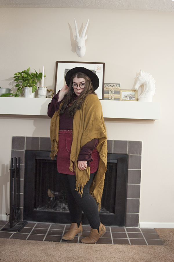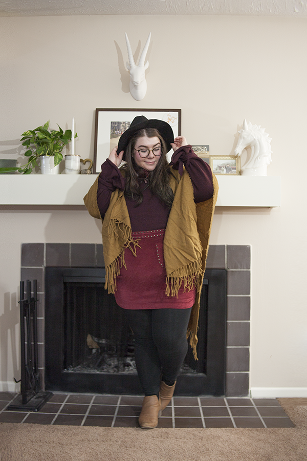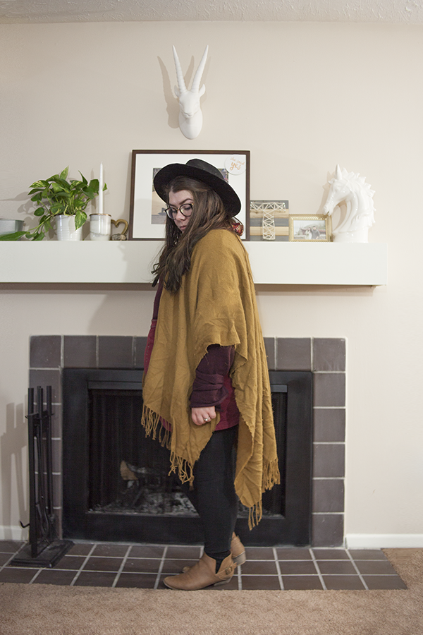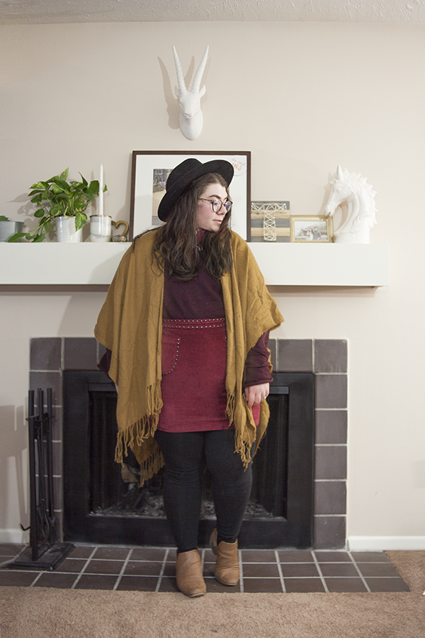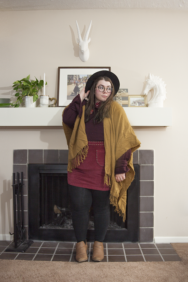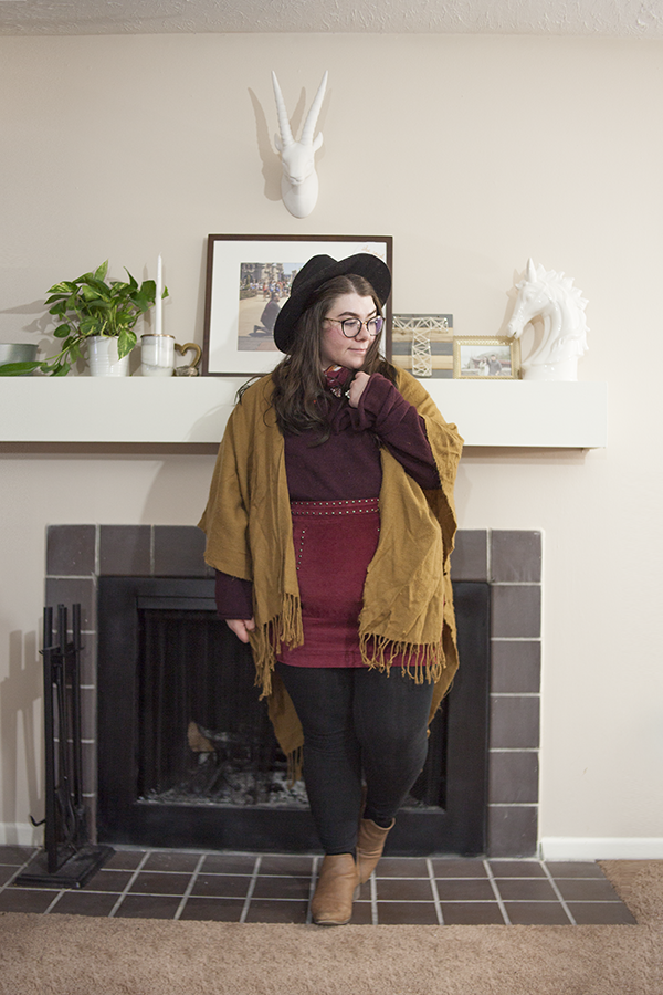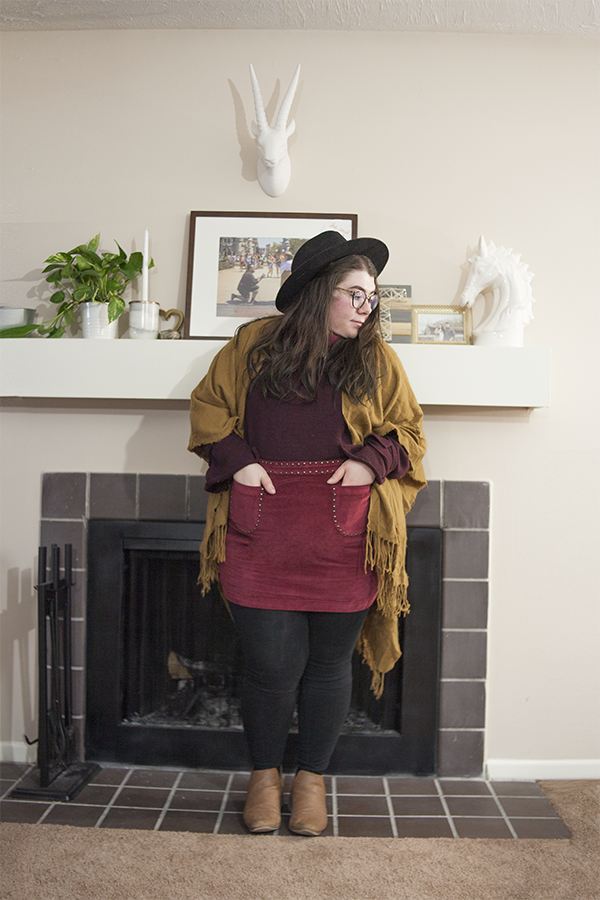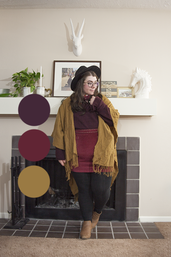 I'm glad I was able to create and wear this outfit when the weather still permitted! This tie sleeve sweater is a thrifted gem I picked up recently and it is the perfect color for this palette. Paired with this old red cord skirt from Target and this old Forever 21 shawl, I've got all the colors!