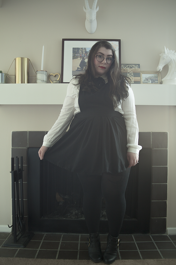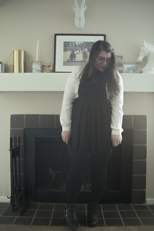 I don't think this is the most perfect pinafore I could have ever gotten, I think the panel in the front is too narrow, and the skirt is too short, but I do love the look of it. I've been looking for pinafores for what feels like forever now, because I really like the look, but it's hard finding one that isn't overall style. Some people look great in overalls, I am not one of them.