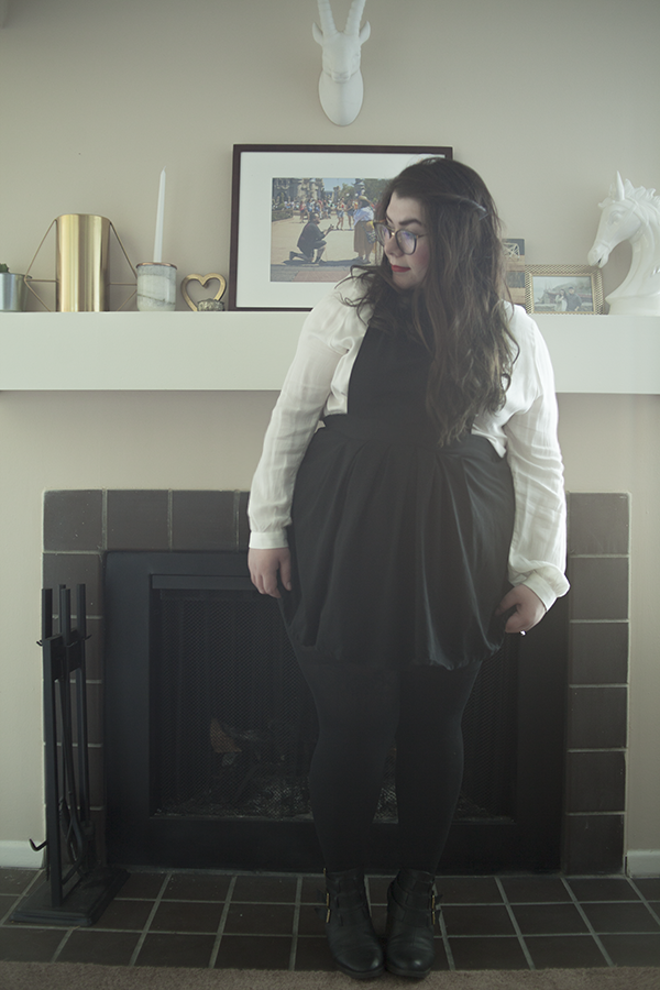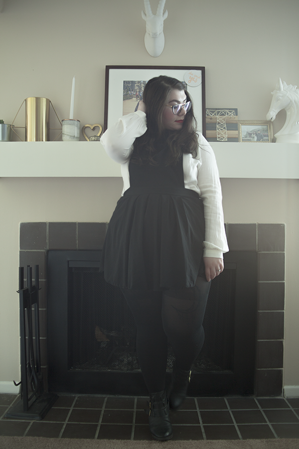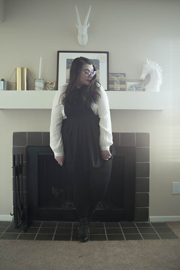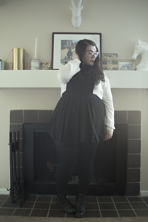 I love the look of layering a super feminine top under these kinds of pinafores, so I added this Peter Pan collared blouse and added tights and heeled boots. I love this feminine look, but I'm still kinda iffy about pinafores as a whole on me. I'll have to style them a few more before I give it yay or nay.