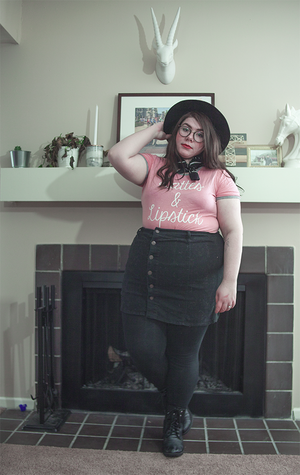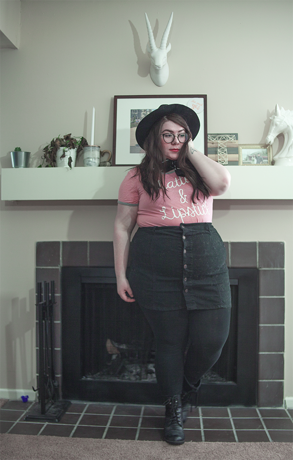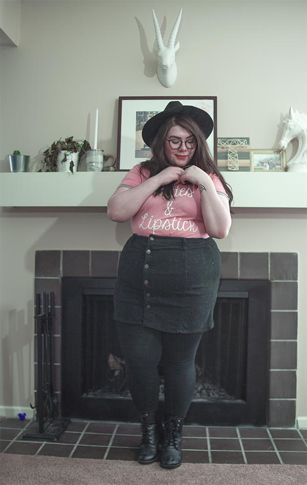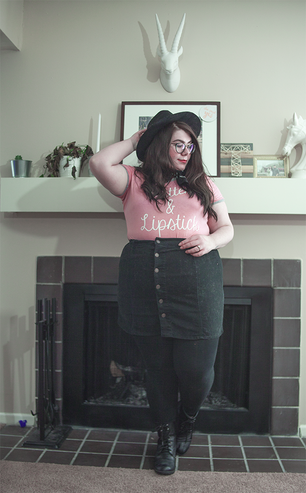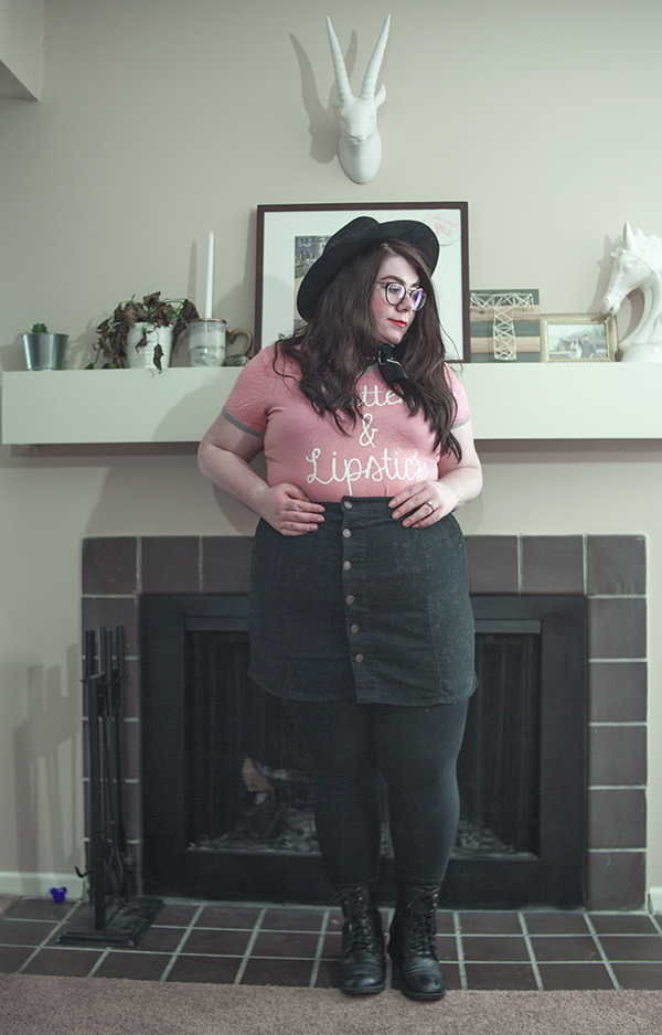 I've had this tee for a long while, and I've worn on it on here before, but on this chilly Sunday, I wanted to be comfy in this errand filled day, so I donned it again, this time, skirt in tow. With a wide brim hat (because duh), tights, and boots, it's cool girl mixed with girl who doesn't know how to look at a camera. Guess what girl that's referring to.