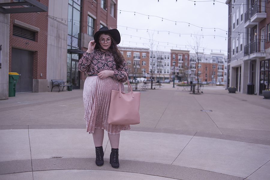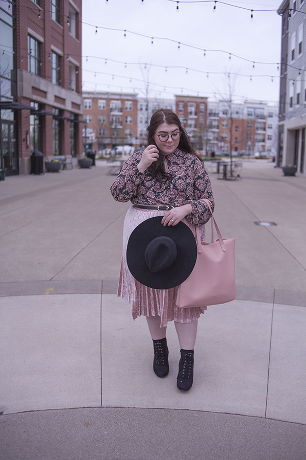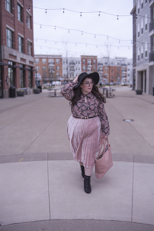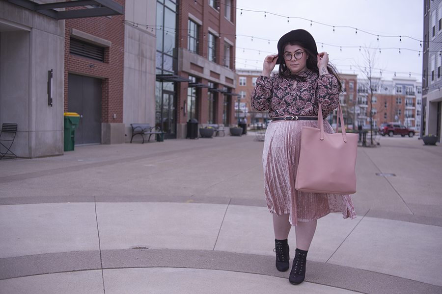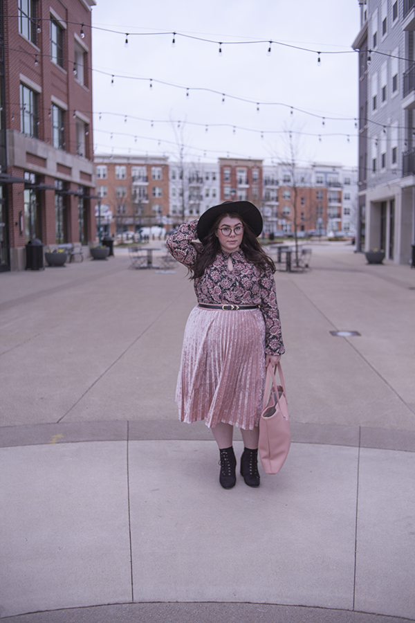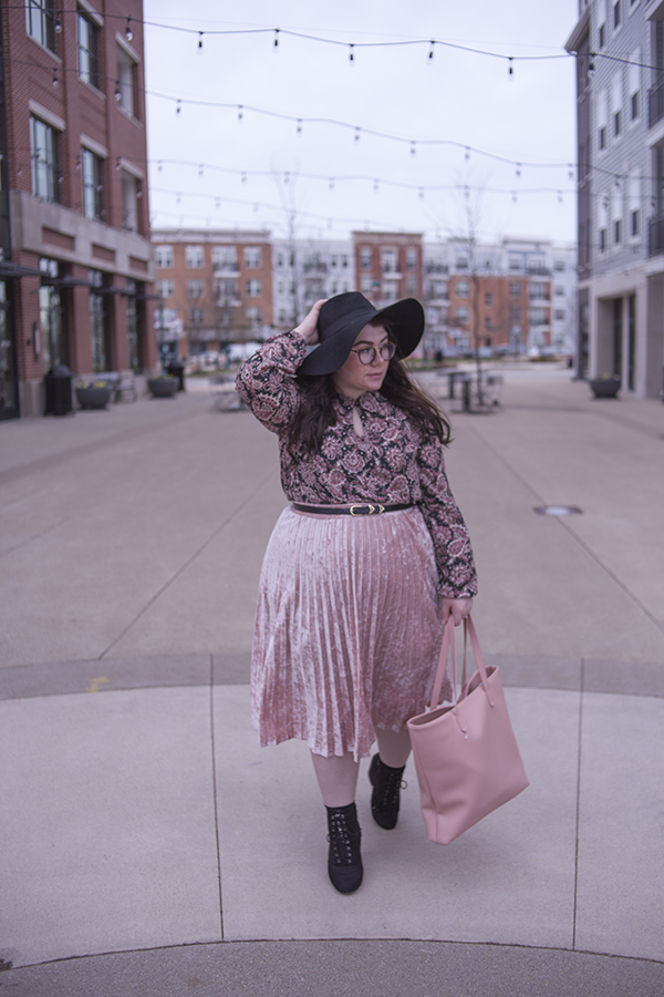 I love pink for Spring (obviously), so I wanted to match pink with pink and hints of black for a safe yet Springtime look. This paisley dress as a top is a perfect compliment to the velvet skirt, and the large black hat and heeled booties help balance the outfit out.
