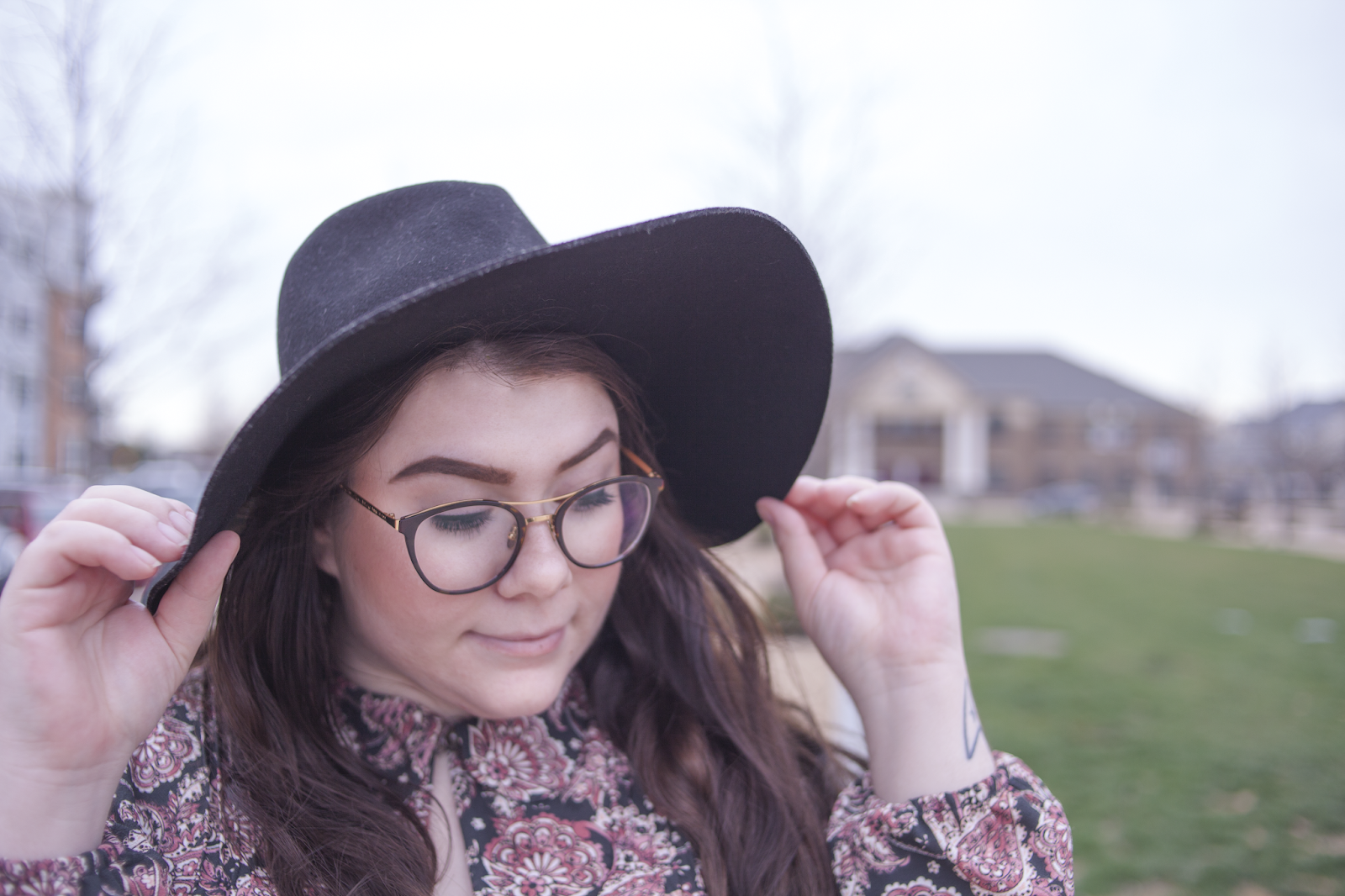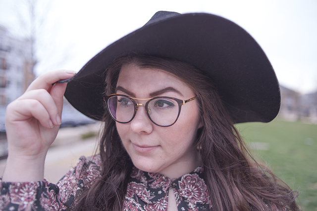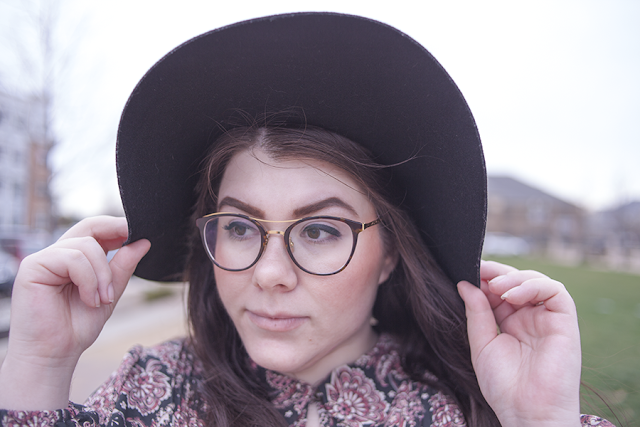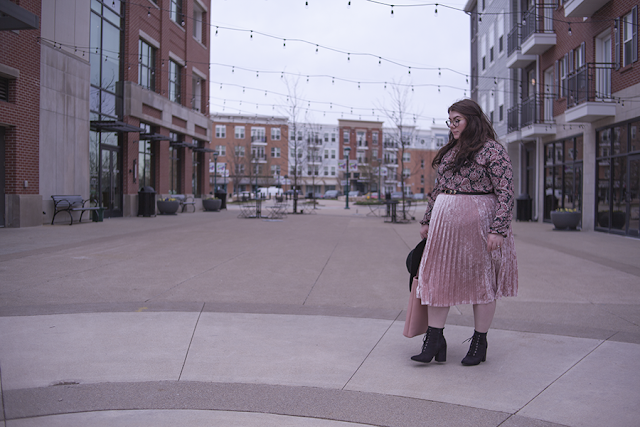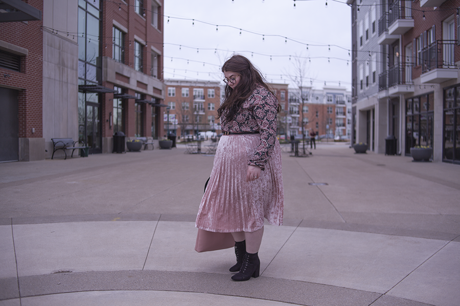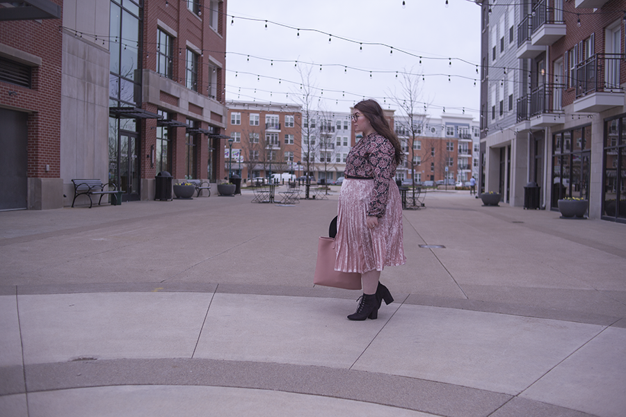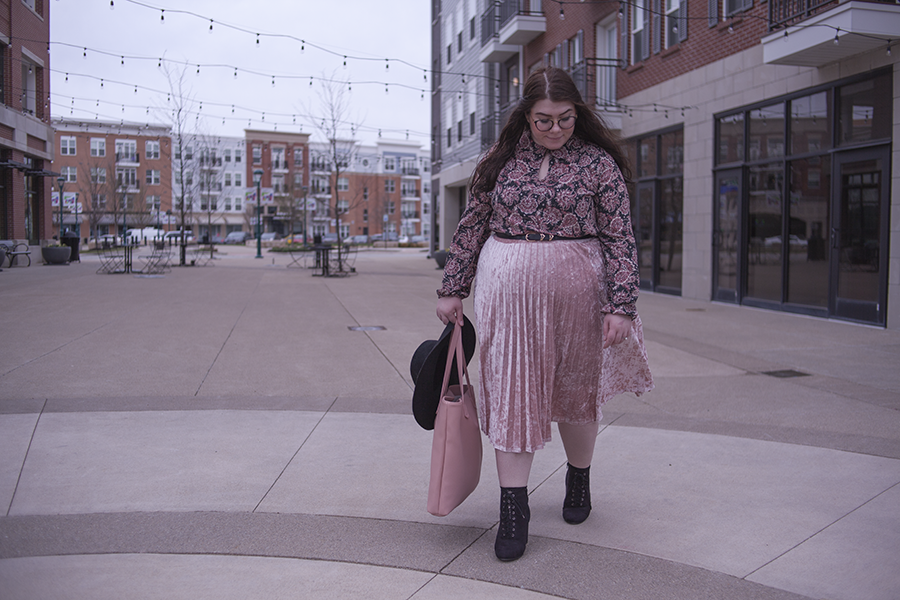 I love pink for Spring (obviously), so I wanted to match pink with pink and hints of black for a safe yet Springtime look. This paisley dress as a top is a perfect compliment to the velvet skirt, and the large black hat and heeled booties help balance the outfit out.