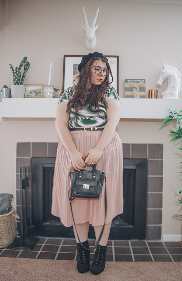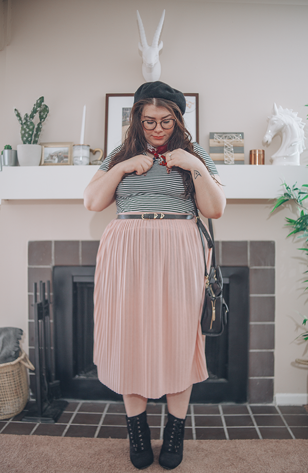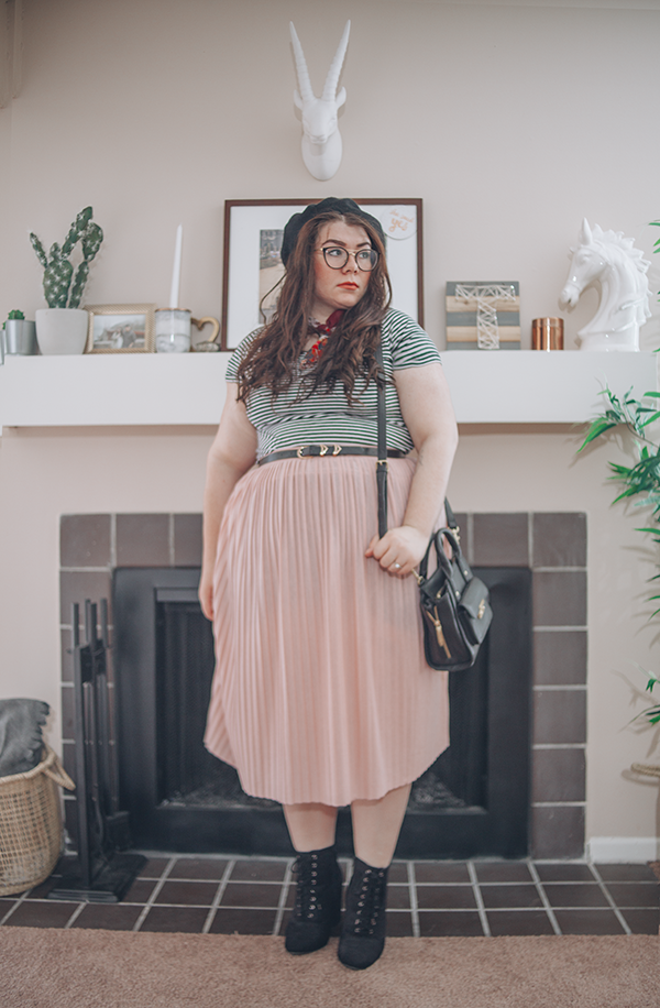 Stripes are my underrated pattern of choice. They are not in any form underrated in the real world, but in my style world, I'm a floral and polka dots kinda gal. It's every few years that I fall in love with striped again and act like no one else is giving them the respect they deserve, when I know it's quite the contrary. I paired this tried and true old tee with another tried and true pleated skirt for a semi-French inspired look. I added a floral neck tie and of course, a beret, to complete the so not French look.