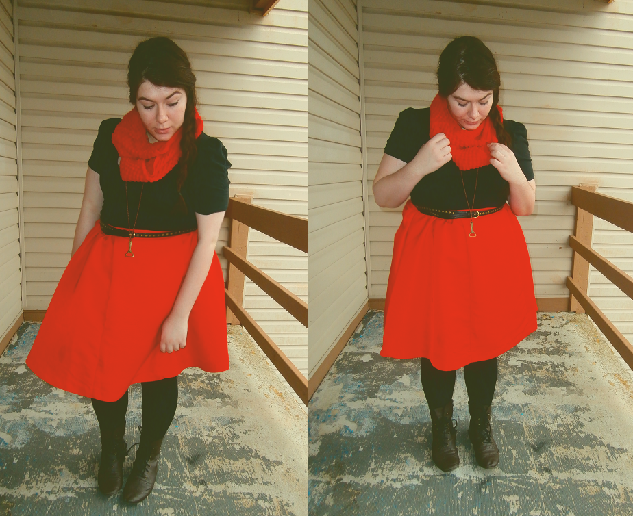 I paired the dress with a plan black top and a red scarf and some boots. It's a basic outfit for a chilly day. And, obviously, a coat goes over top. It's a bit too cold for venturing out in the cold without a coat on.