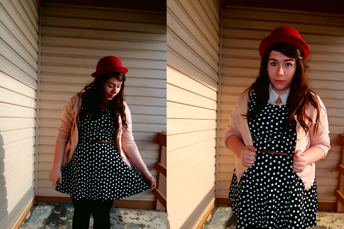 I like layering sweaters over dresses, it makes them more warm and also, it's a cute way to play peek-a-boo with a dress. I layered this sweater I thrifted over my polka dot dress that my best friend got me for my 20th birthday. I like this look because it's simple yet put together.