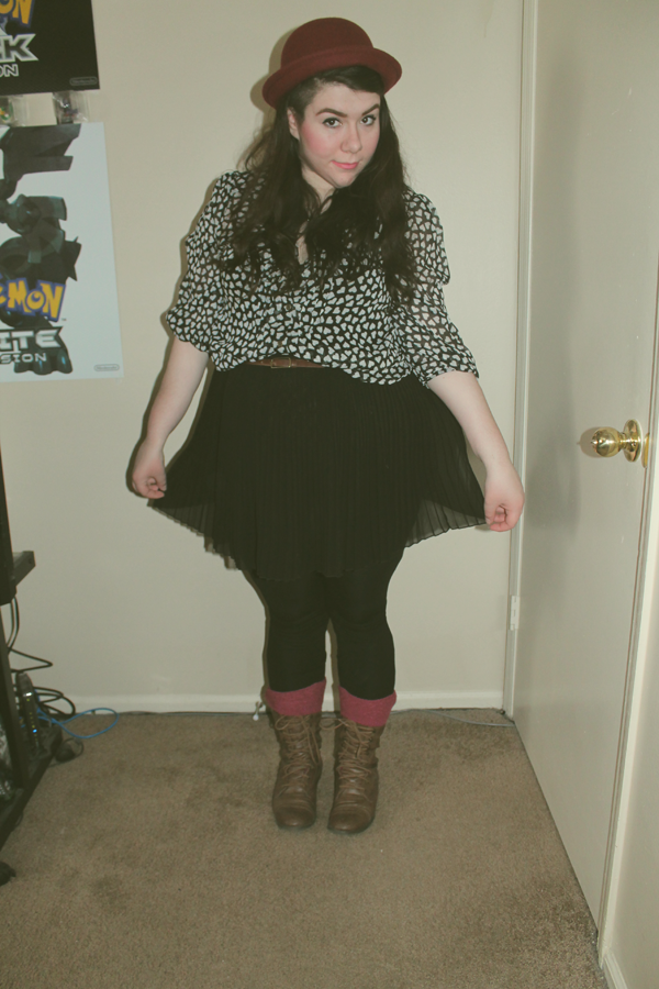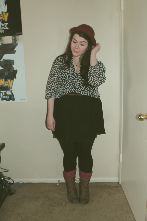 Hat-eBay|Coat-Thrift|Heart Print Blouse-Thrift|Skirt-Forever 21|Boots-Thrift