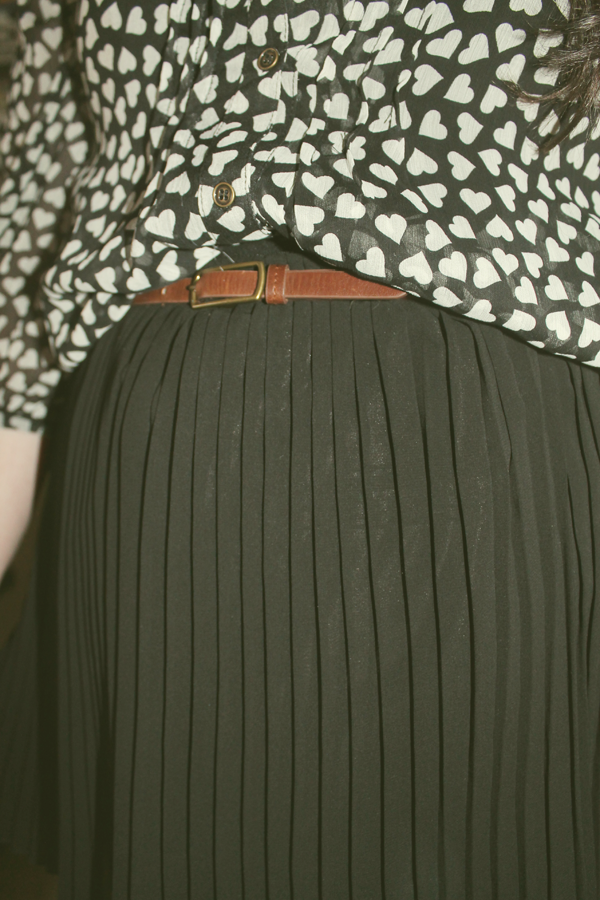 This heart printed blouse I thrifted is so adorable. It's originally from Target (I can just tell), and it's actually quite transitional. Worn with the right things, it's definitely work place appropriate. But, it's casual and sweet worn with a skater skirt and boots, as well. It's lightweight, so you can wear it in the warm months and you can layer under and over in the cold months. Yay for transitional pieces! The only thing I dislike about the top is that it has awkward 3/4 length sleeves.