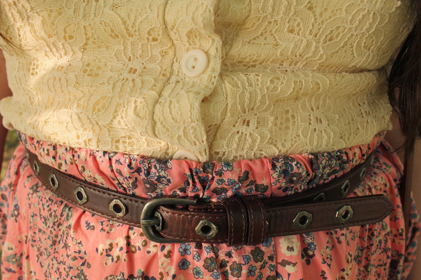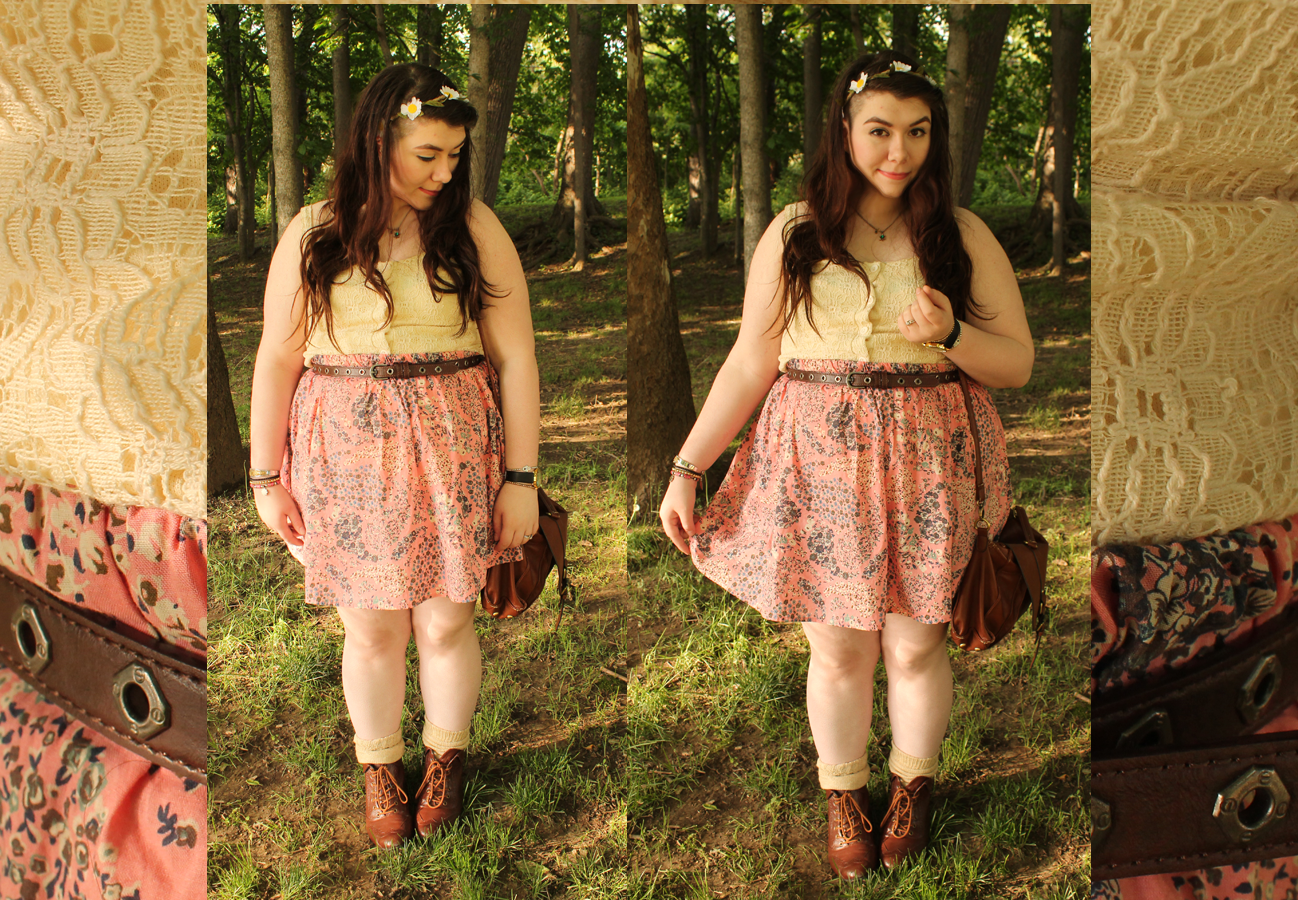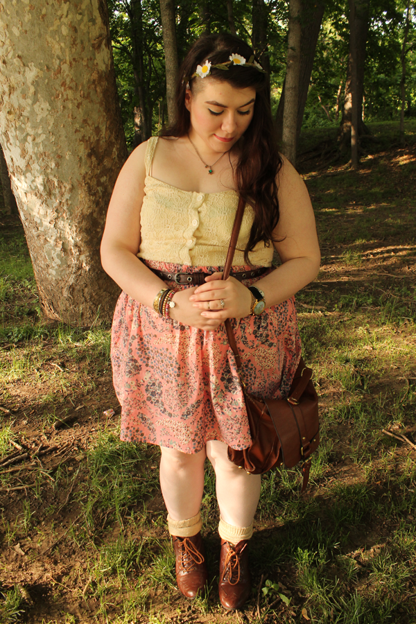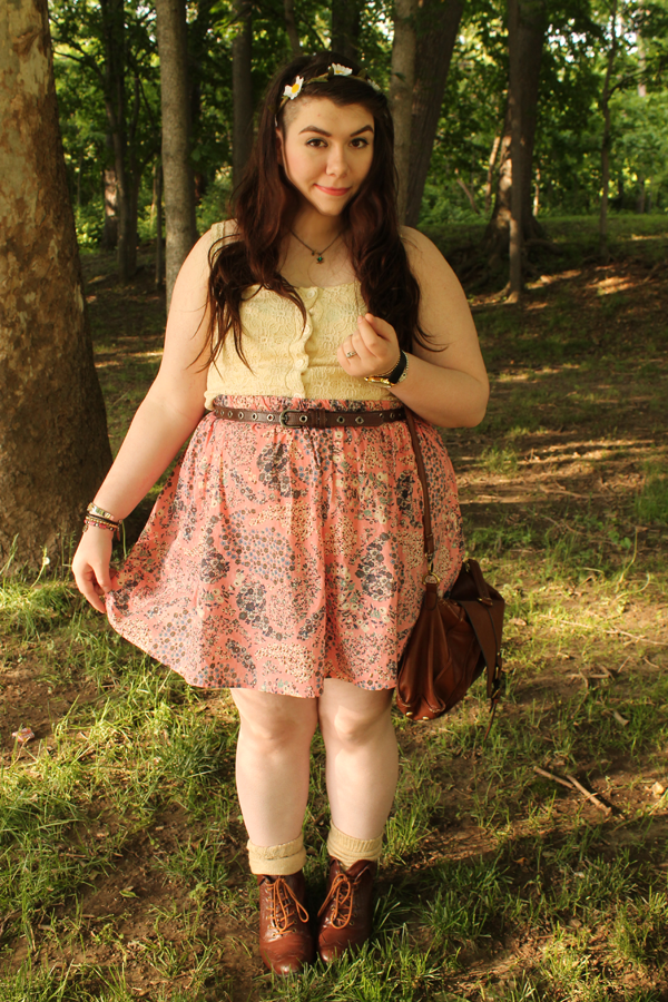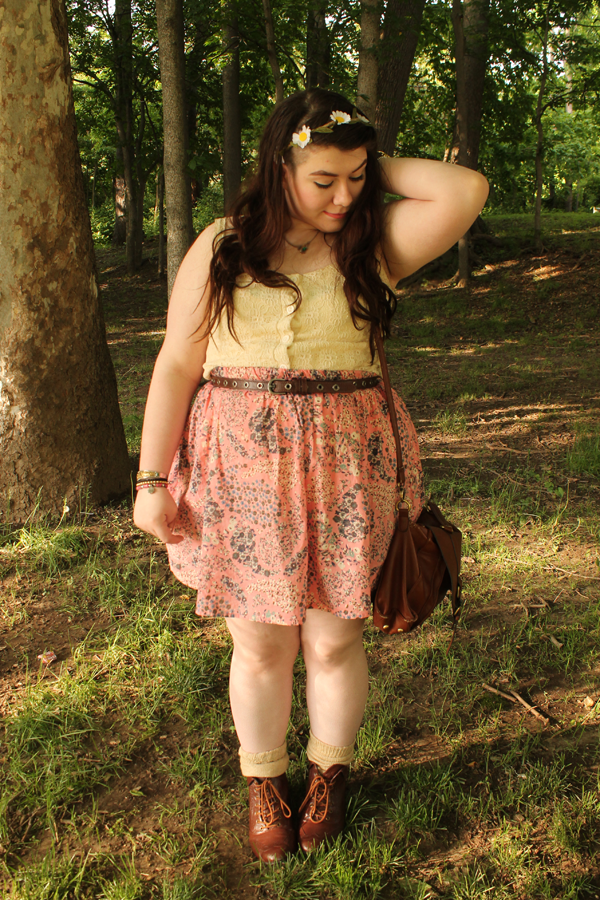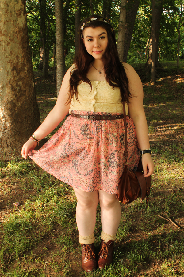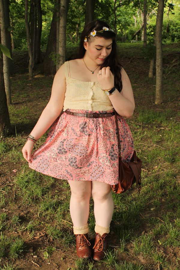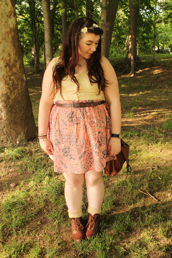 It dawned on me today that I have never actually taken pictures with this skirt on. It was actually one of my first purchases from Poshmark. It's originally from H&M, and it's a little lovely pink paisley floral print. It screams spring. I paired it with a crochet knit crop top I thrifted a while ago, and my overly loved brown ankle boots, also thrifted. I wanted something light and airy today because it's in the high 70s and it's gorgeous out. #endsuffocatedlegs2k14, remember?