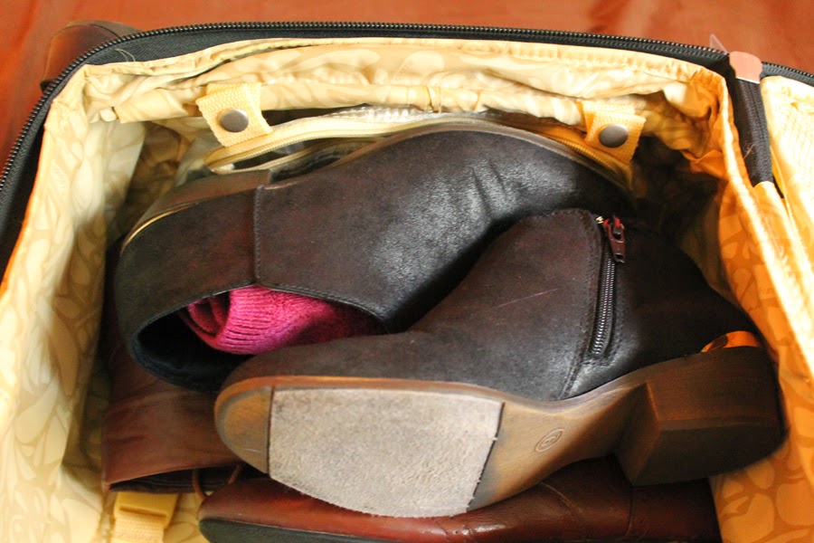 I then pile the shoes into the bag heel to toe. The flatter shoes can be squished in the empty space, along with belts.