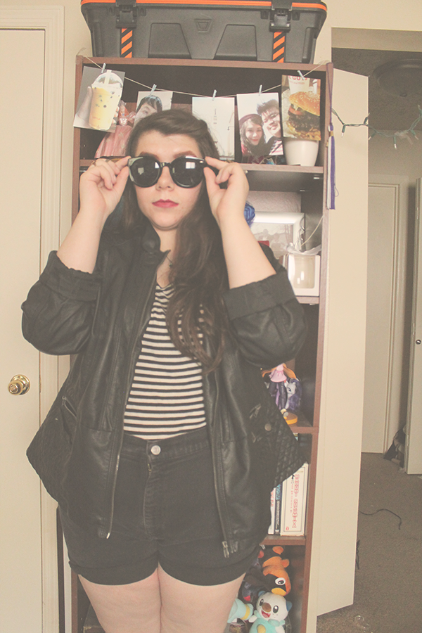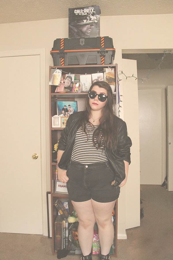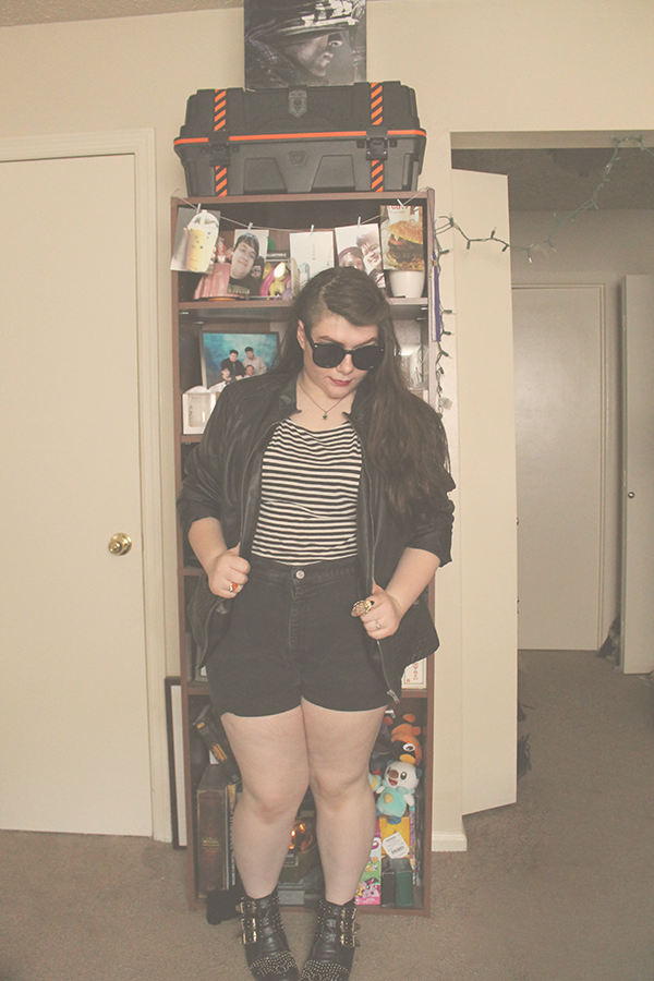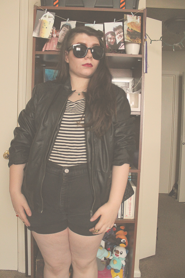 Jacket--Thrift//Striped Tee--Thrift//Shorts--Secondhand//Boots--Secondhand