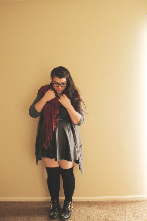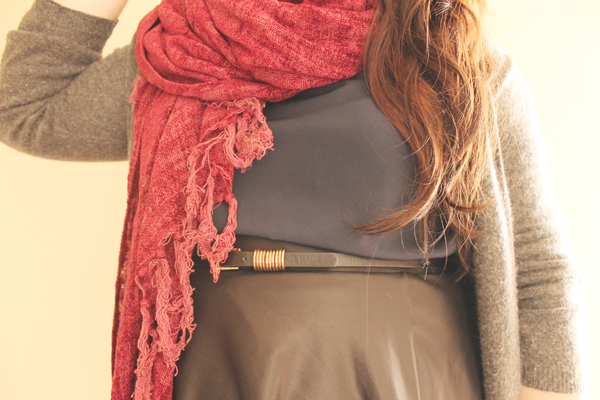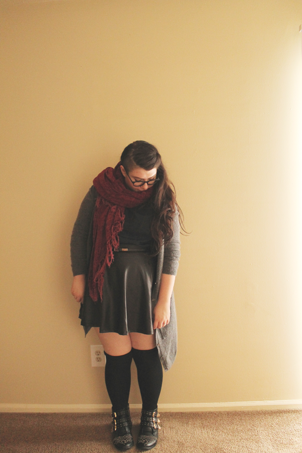 I threw it on top of my peter pan collared navy blouse and leather skirt skirt combo, and the navy and maroon go together in harmony. I really do love this color combination, and I will definitely be wearing it again, soon!