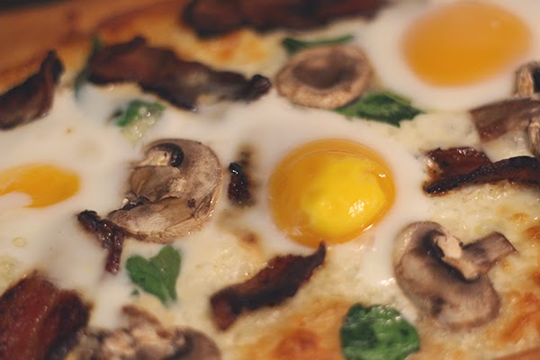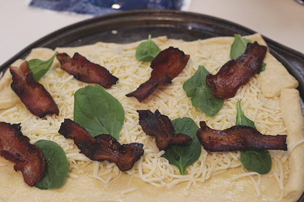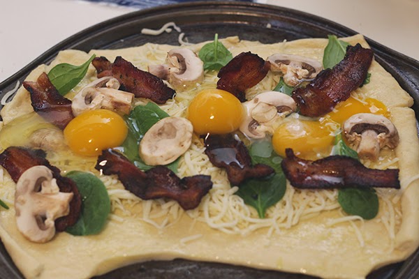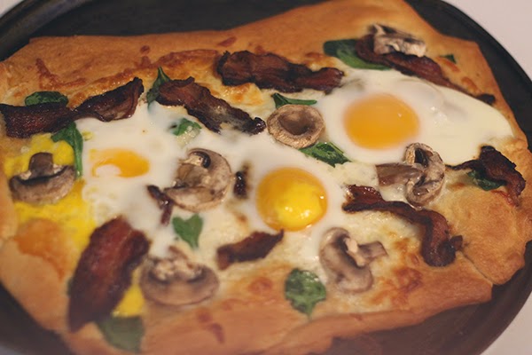 I like that this pizza is light, in weight and on the palette. Bacon, though naturally heavy and greasy, is balanced with the crescent dough, spinach and mushrooms, making a great breakfast--or anytime--pizza.