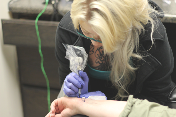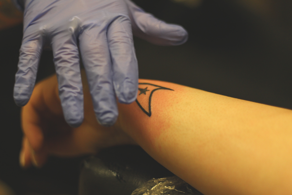 The artist put a stencil on and made sure I liked the placement before she started tattooing. My tattoo took about 15 minutes, because of it's simplicity and size. After I was finished, my tattoo started oozing out ink and plasma, which is totally normal. The artist put ointment, and wrapped my wrist up to protect it for a few hours.