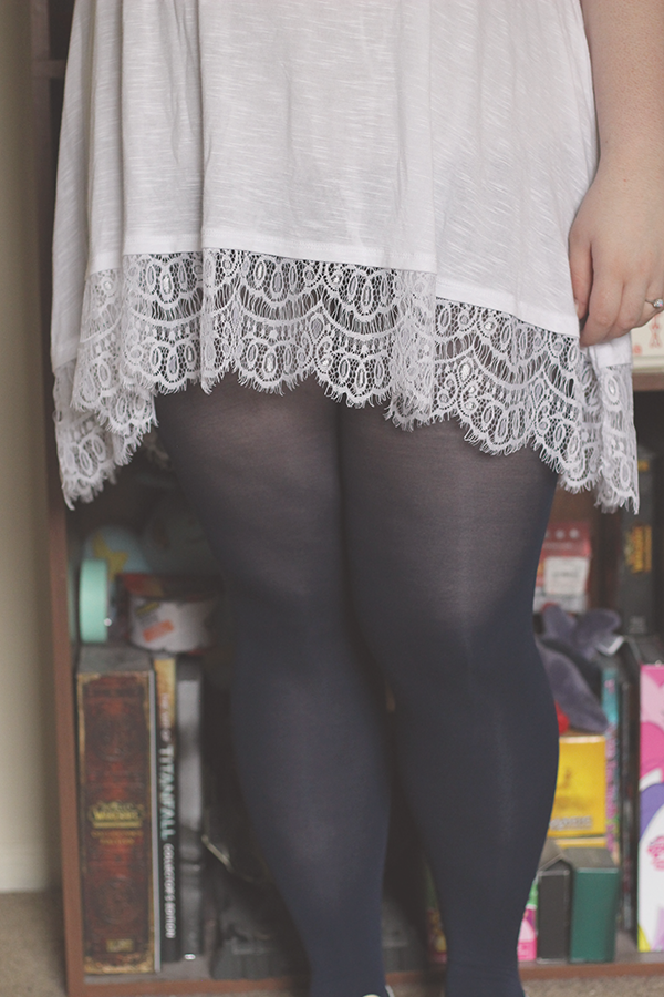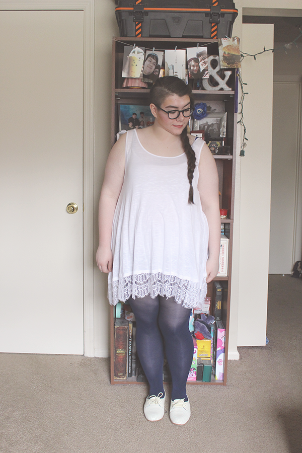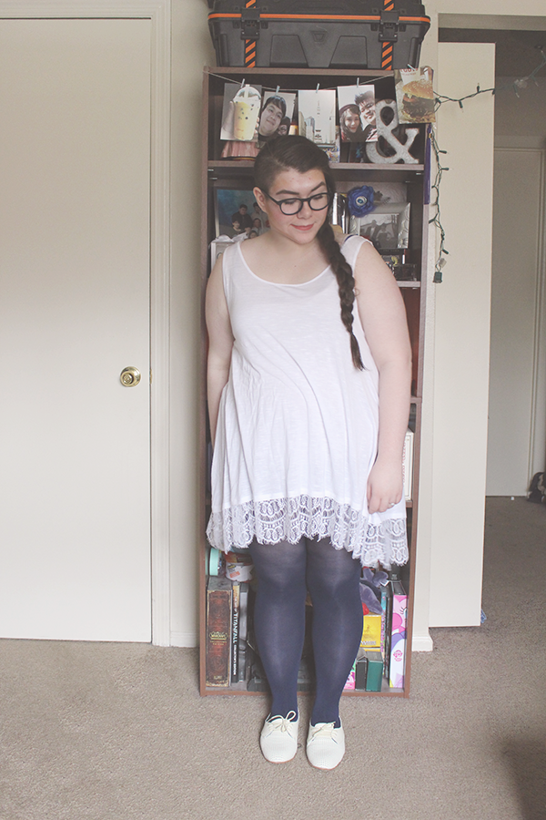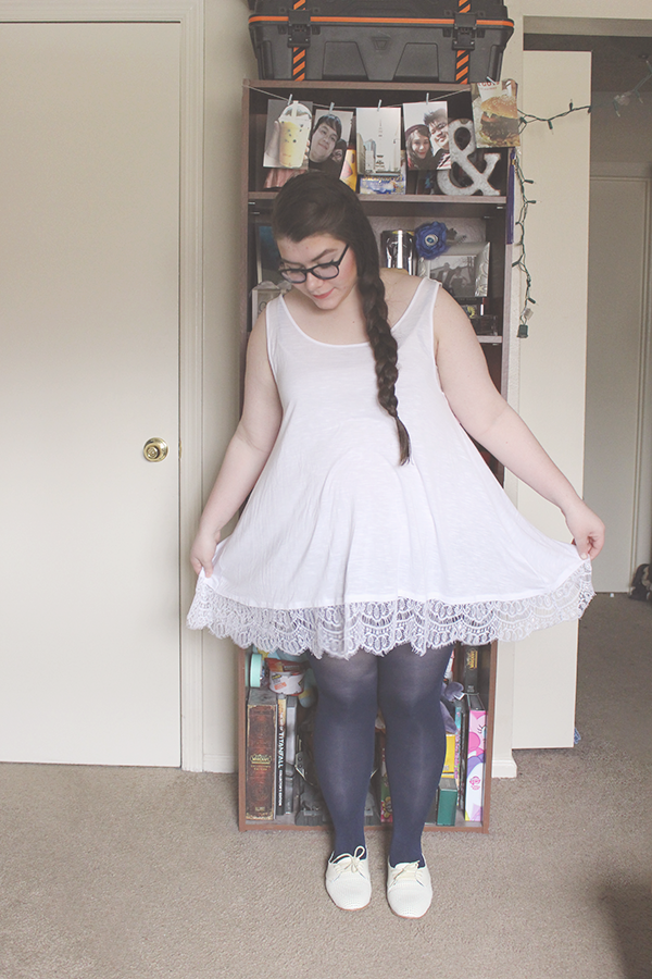 So, I have a tank top like this I bought at Wet Seal, and I found this gem, of almost the exact same thing at the thrift store. This is why I dislike paying full retail because I tend to find the same thing in the thrift store. This was in the tank top section, but it's long enough and big enough on me to pass a dress. Though, I think this would be super cute with a kimono and sandals for the summer time too. I paired it with my new navy tights because it's rainy and gross today, and also because I have a huge, unsightly bruise on my leg.