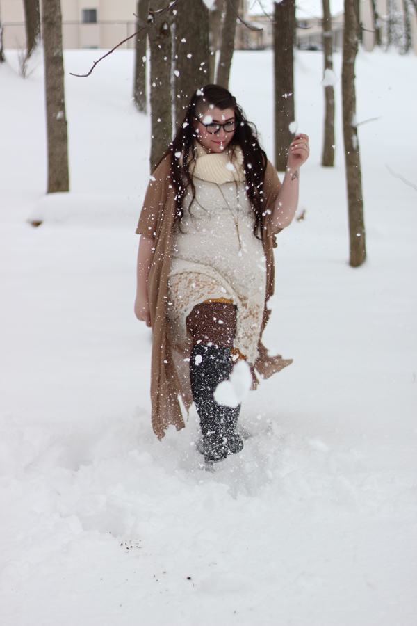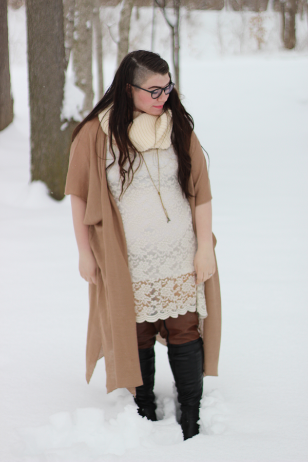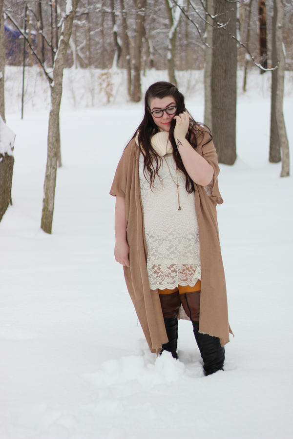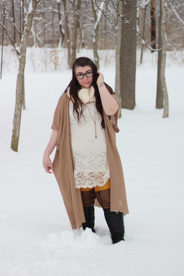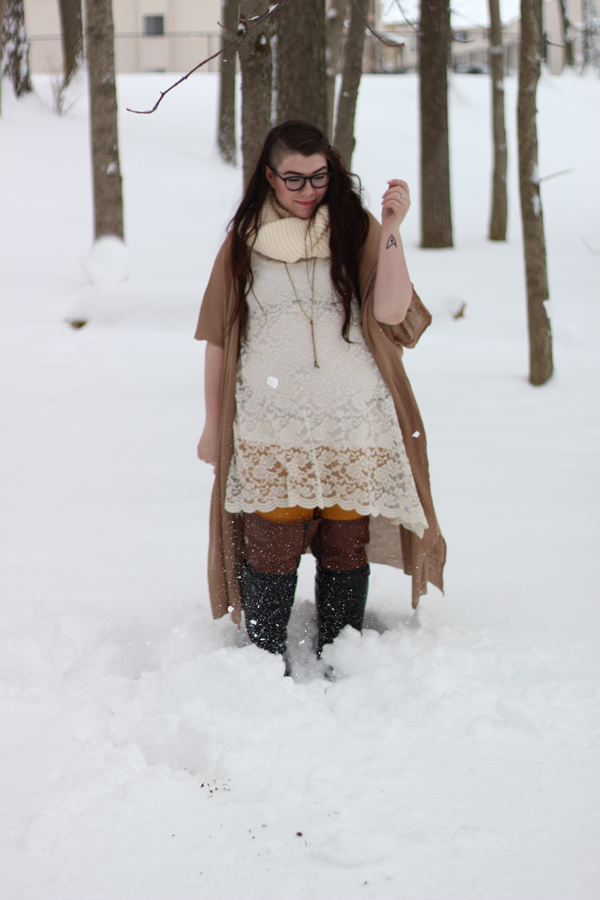 I thought the snow needed some color and I decided, what the hey, I'm going to wear yellow tights. Yellow and brown is a killer combo, and I love how the yellow peaks out through the lace and above the boots. It's March 1st. and there's 7 1/2 inches of fresh snow on the ground. Happy March, Indiana.
