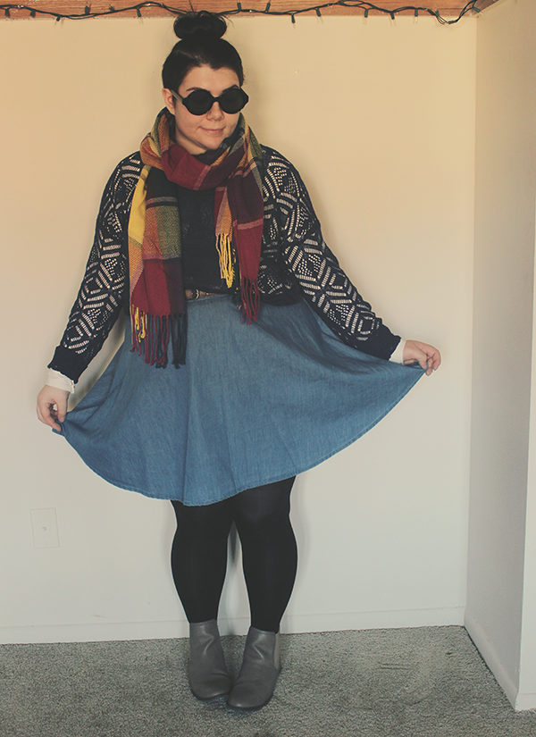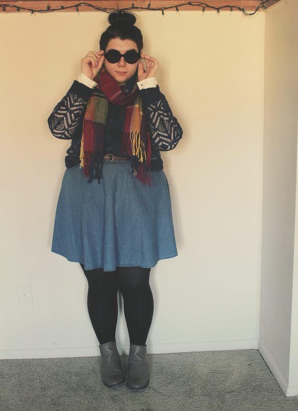 I had to wear these things immediately, I mean, it's cold and bright and I couldn't help myself! Since it is pretty dang chilly out, I layered a sweater over a collared blouse, and tights under a chambray skirt, then chucked on my new scarf and sunglasses.