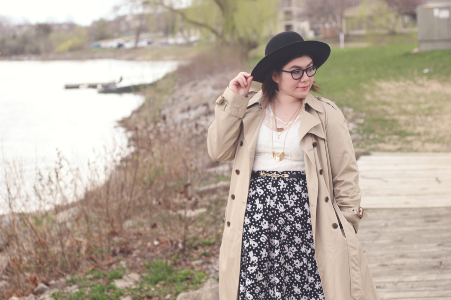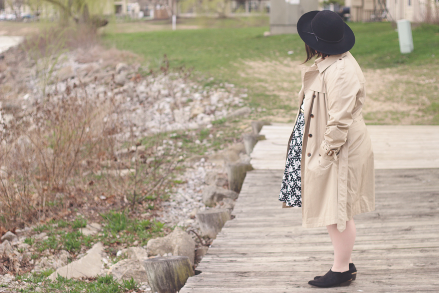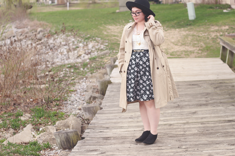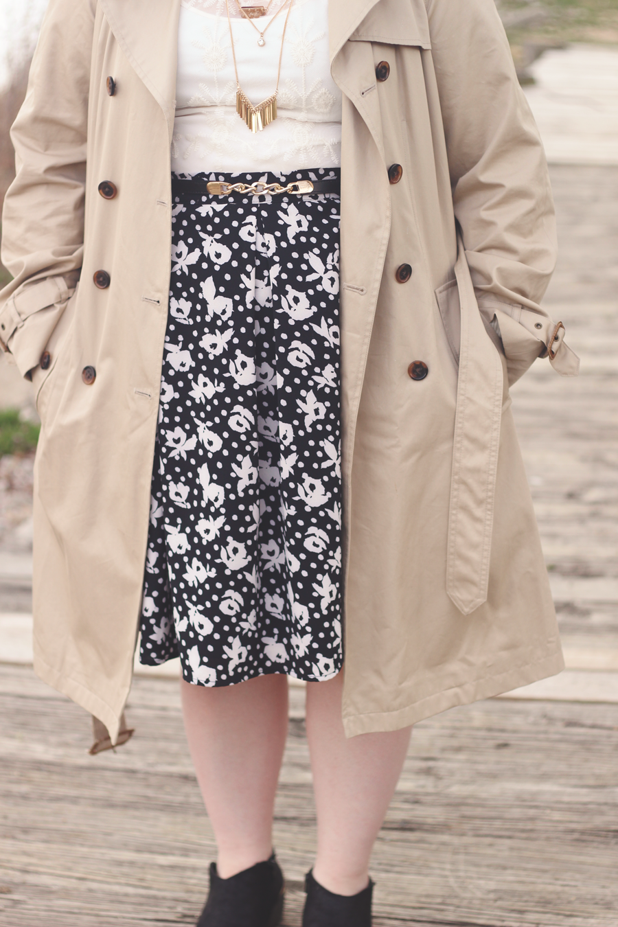 I went with a really limited palette on this dark and dreary Easter afternoon, and I kept the outfit fairly simple by using classic colors and silhouettes. The trench adds some dimension and keeps me dry, whilst the blouse and skirt allows Spring to showcase itself.