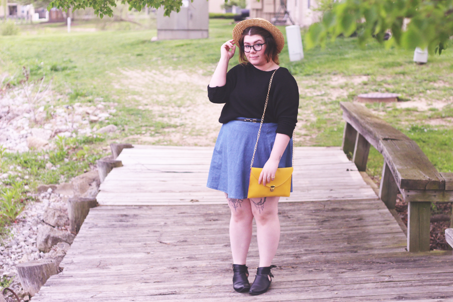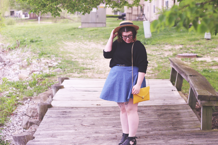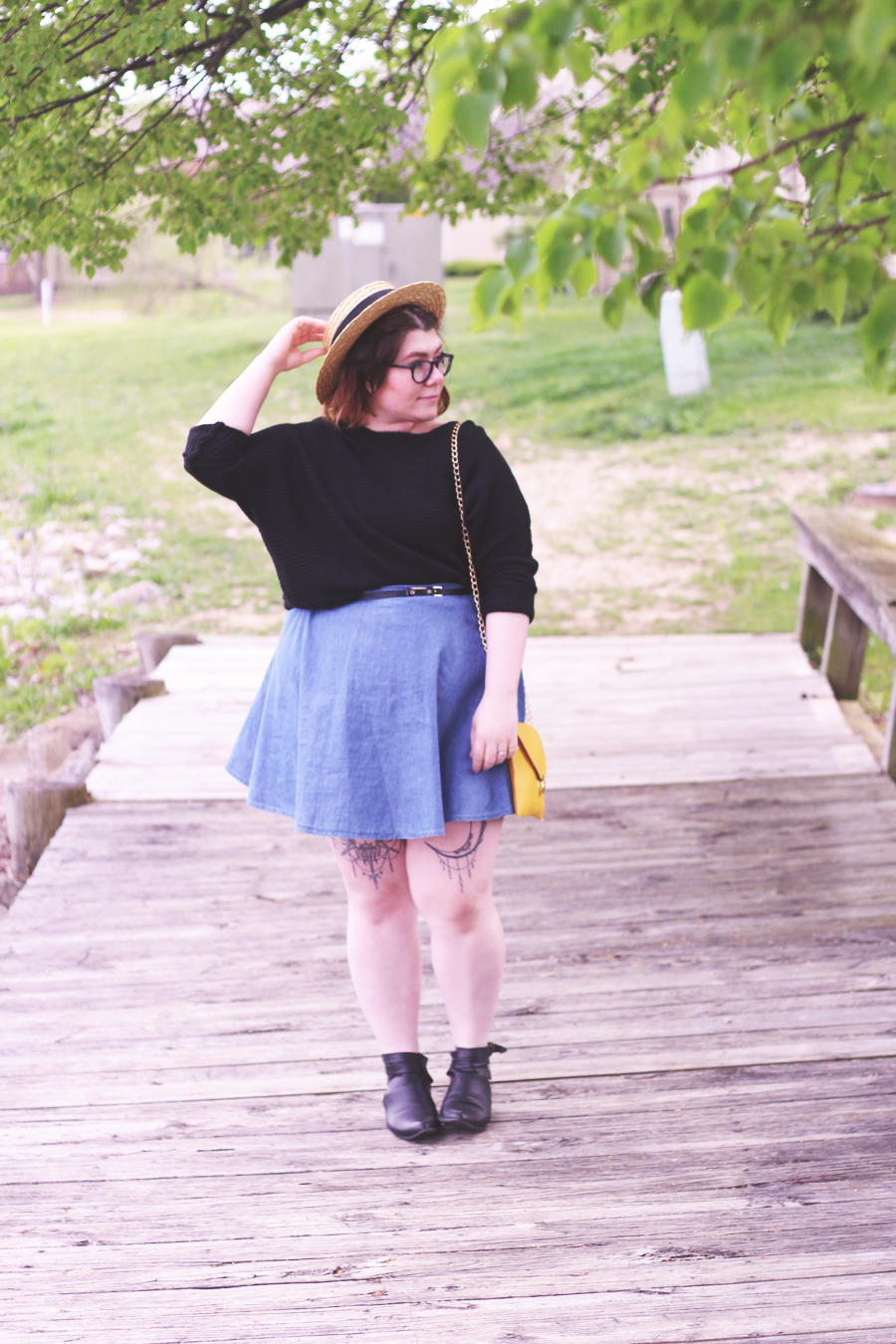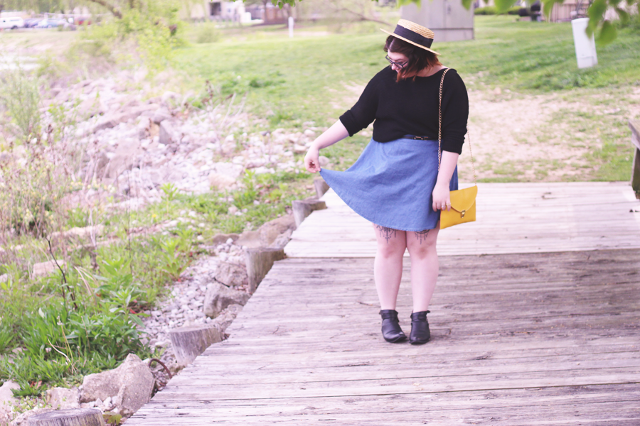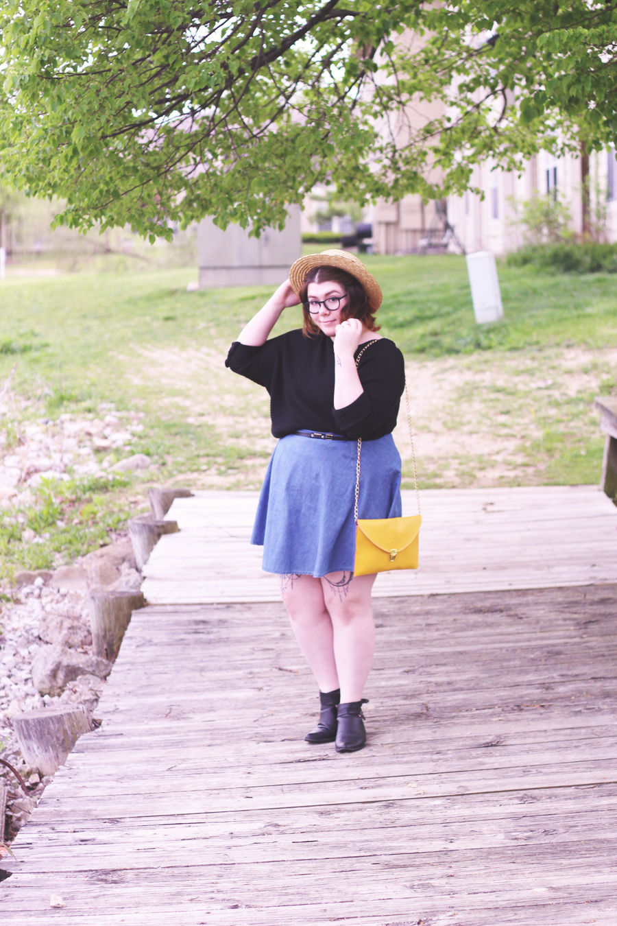 Mixing seasonal items, like sweaters and boater hats, can make for a really interesting outfit. I don't think I'd ever mix a coat with flip flops, but sandals and jeans, or cardigans and shorts I could do. I paired the sweater with a lightweight chambray skirt from Forever 21 and a pair of cut out buckle boots. With the addition of a thrifted straw boater hat and an envelope crossbody, this outfit was perfect for a burger lunch outside and cloudy drive around the city.