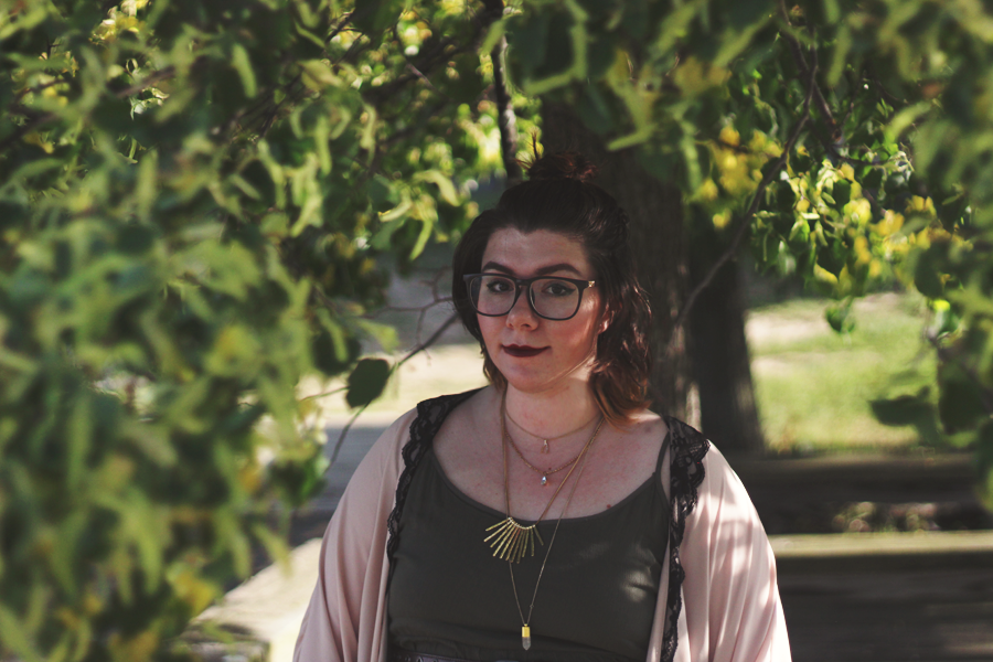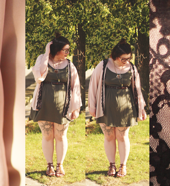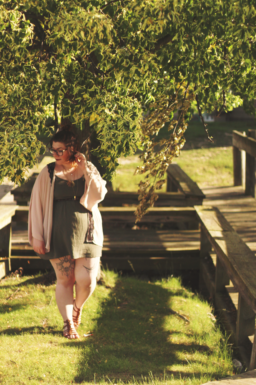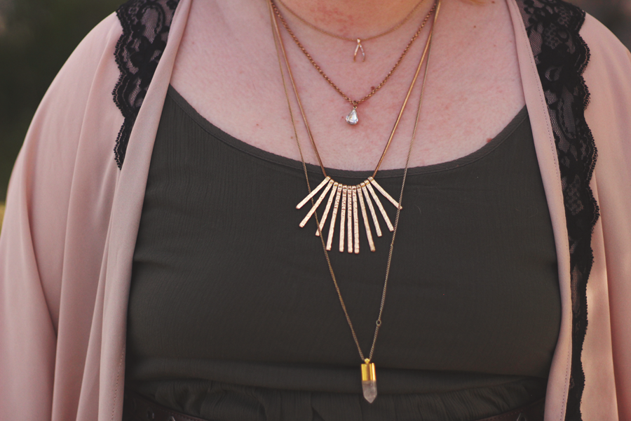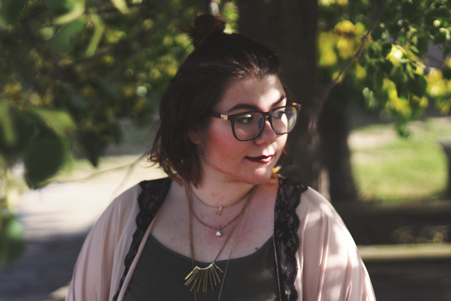 I paired this olive green dress from Forever 21 with this thrifted pale pink kimono for some visual interest and sun protection. I doubted that olive green and pink look together before I tried this, but I have to tell you, I'm sold on this color combo. I added some long layering necklaces, a simple bracelet, threw my hair in a hipster bun and swiped on some dark lipstick. I don't know if I have the face and hair to pull off a hipster bun, because my hair is at an awkward length, plus one side of my hair is shorter than the other because I'm growing out an undercut. What do you guys think?