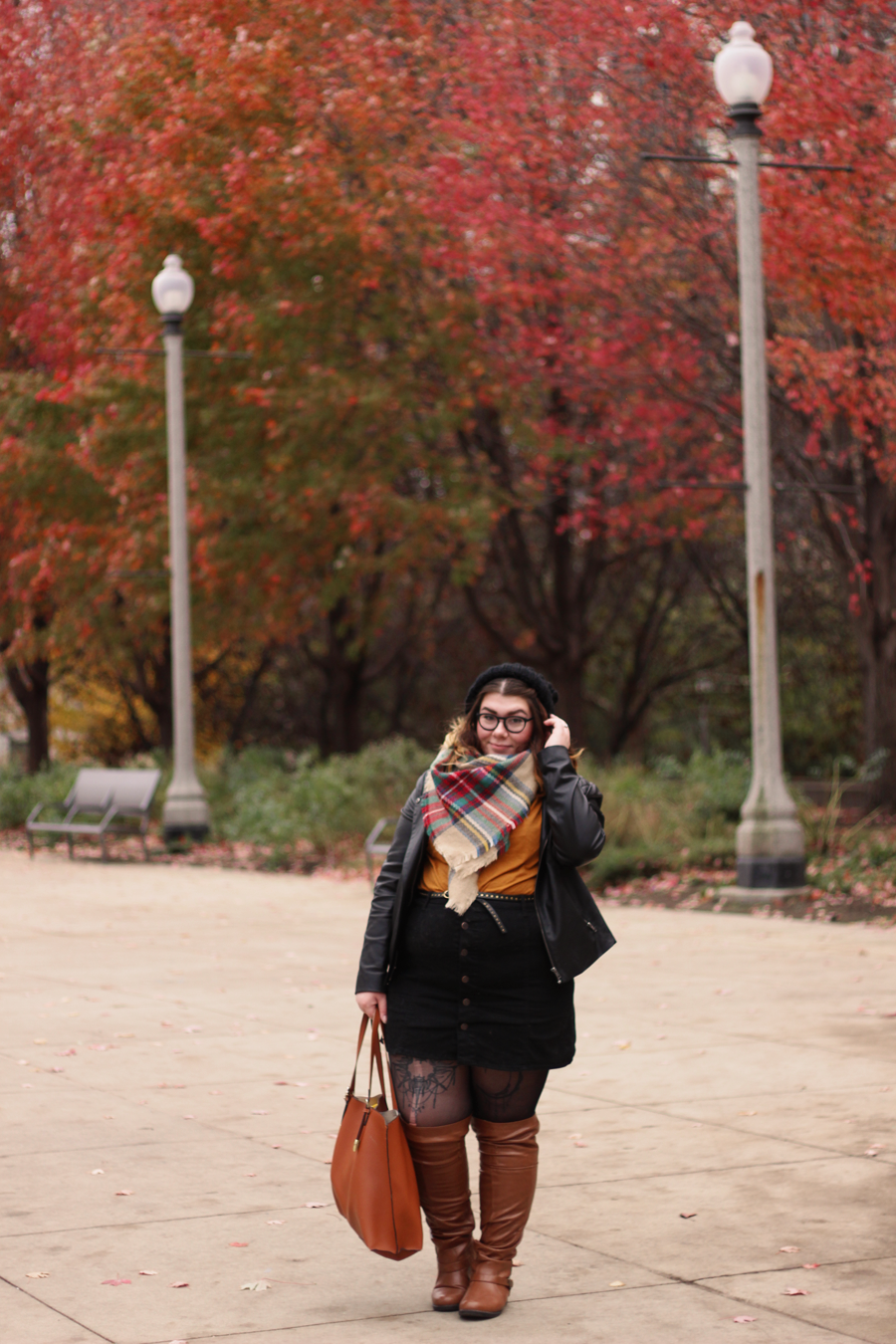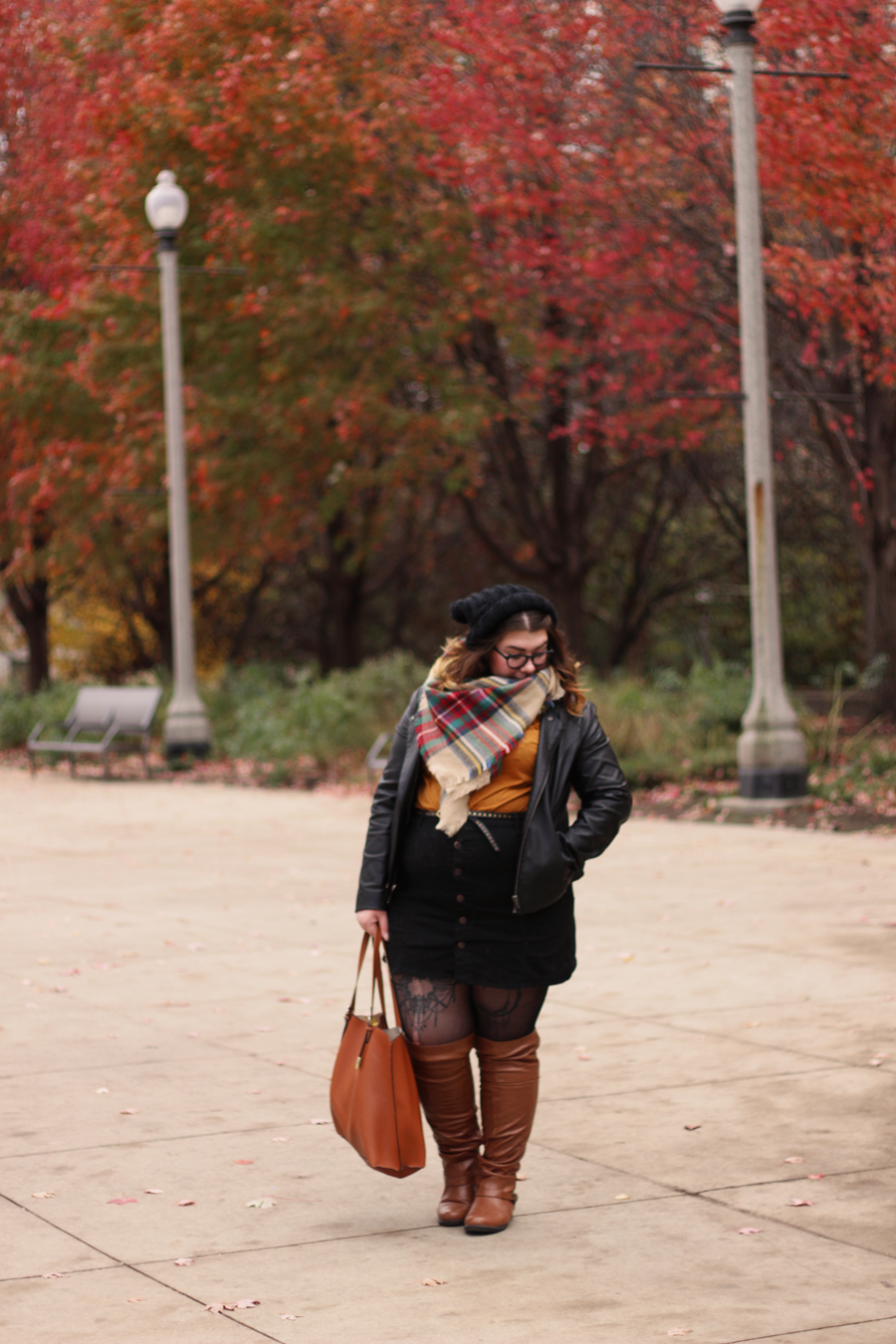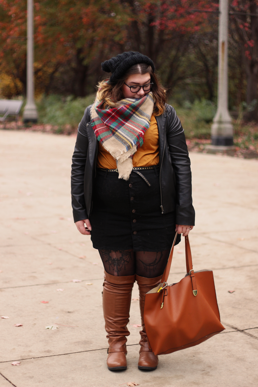The reasoning behind this outfit was that I wanted to wear these newly received over-the-knee boots that did not stay over the knee throughout the day. I wanted to play with the brown by pairing it with mustard and plaid, so I did that and added some black for balance and as a neutral. My tights got a run somehow between walking out of a parking garage and walking to the park, so enjoy, as it was unintentional and too damn cold to go without.