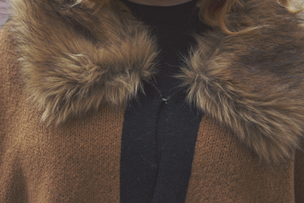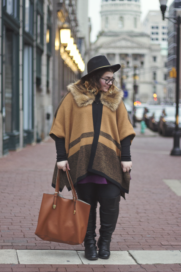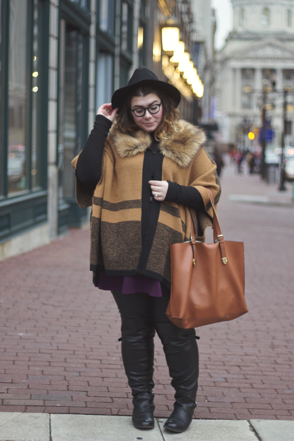 I picked this shawl (that I'm calling a cape. seeing as it has sleeves and a closure) from Forever 21 a few weeks ago and it immediately got warm once I did. I waited patiently until the temperatures dropped before I styled it, as to not torture myself. I love brown and jewel tones together, so I donned the cape over a basic mockneck top from H&M and an old skater skirt. I really wanted to make the cape the focal point of the outfit. so I kept the rest of the outfit pretty basic, with a black hat and black over the knee boots.