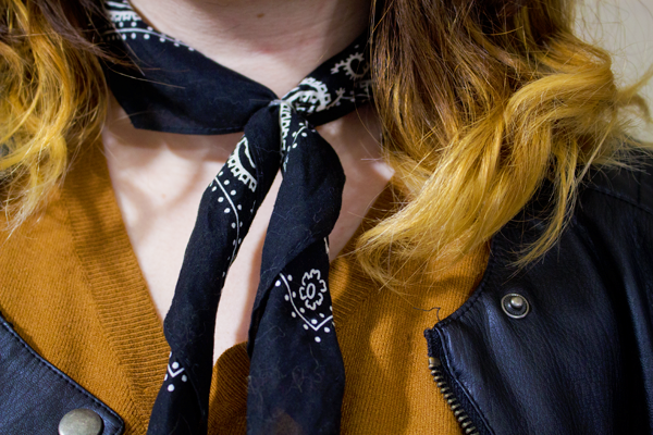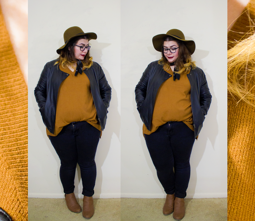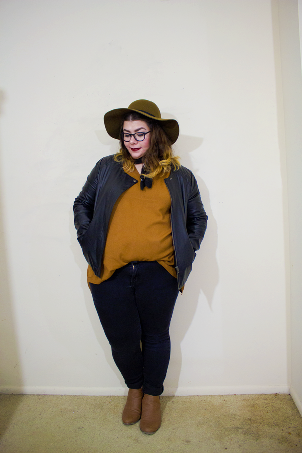 Passing up a good sweater is a sin in my book, so I had to grab this lightweight v neck one from Charlotte Russe. The mannequin had it styled in the most Katie like way ever, so I caved, plus, it was on sale. So score for me. I tucked the mustard baby into a pair of mid rise thrifted black jeans and layered a faux leather jacket atop for some warmth and edge.
