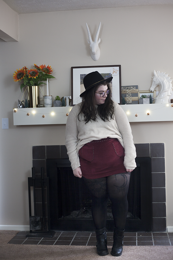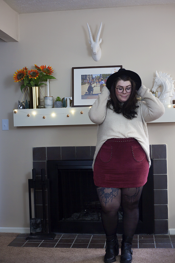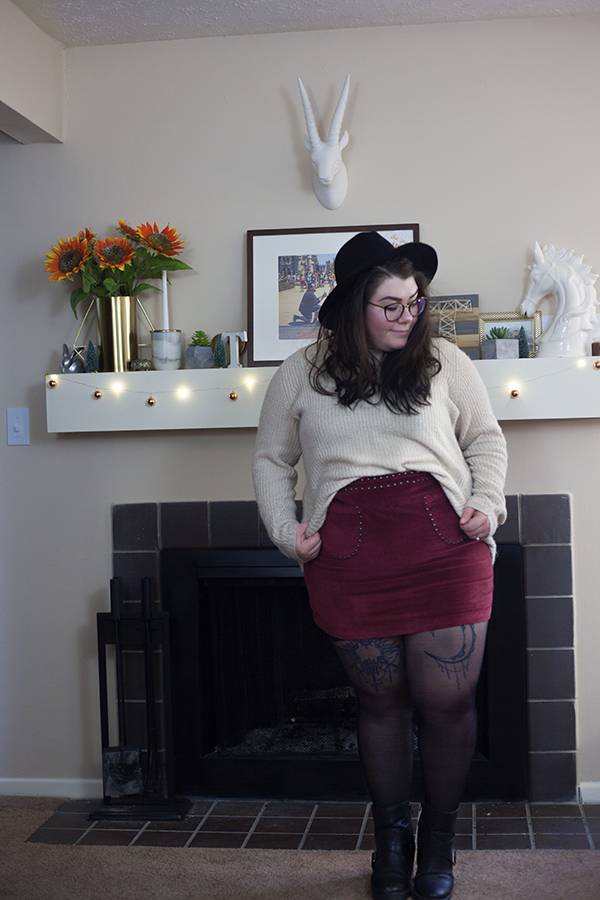 So, because it is getting colder outside (we have snow on the ground!) and my skirt love shows no sign of stopping, I wanted to showcase an outfit that you could wear right now that is going to keep you warm and stylish, even if you have snow on the ground. For the main outfit, I have an old cream sweater half tucked in to this cute studded faux. suede mini skirt. This outfit begs for some sort of legwear for balance, as the legs are bare as the top is covered.