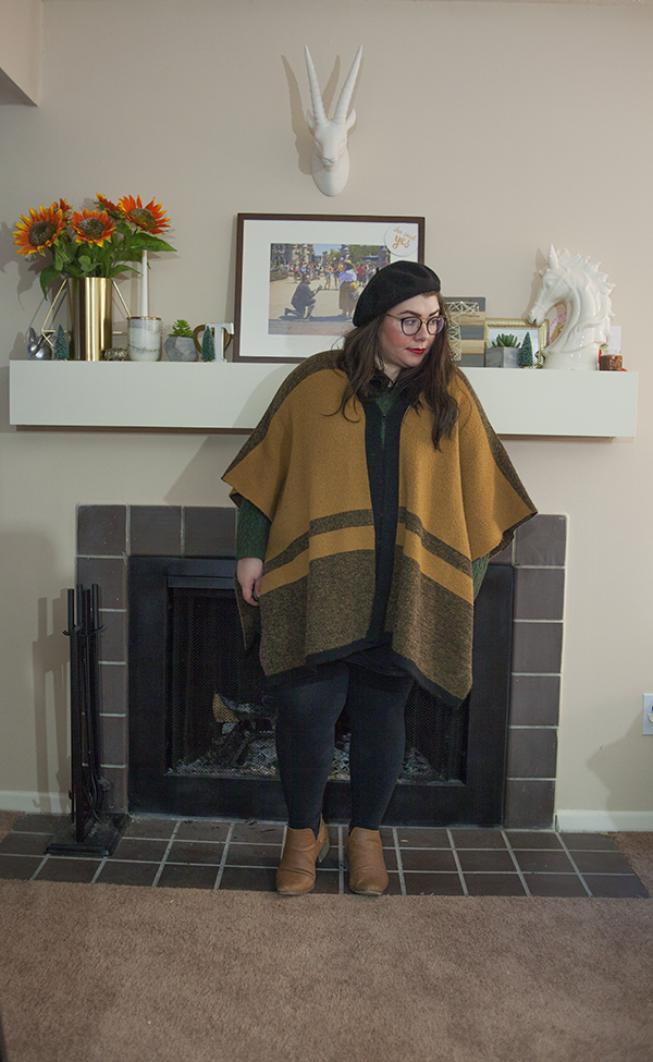I have a real love for capes, shawls and ponchos. I have had this Forever 21 poncho for over a year and I don't wear it as often as I like to. It has a removable faux fur collar and it's heavy and thick, so it is a transitional piece. Today was the first day it was above freezing for over 2 weeks, and this kept me toasty. Thrown on top of this forest green sweater from thredUp that I've featured before, half tucked into an old button down Target skirt, it's the perfect Sunday errand outfit.