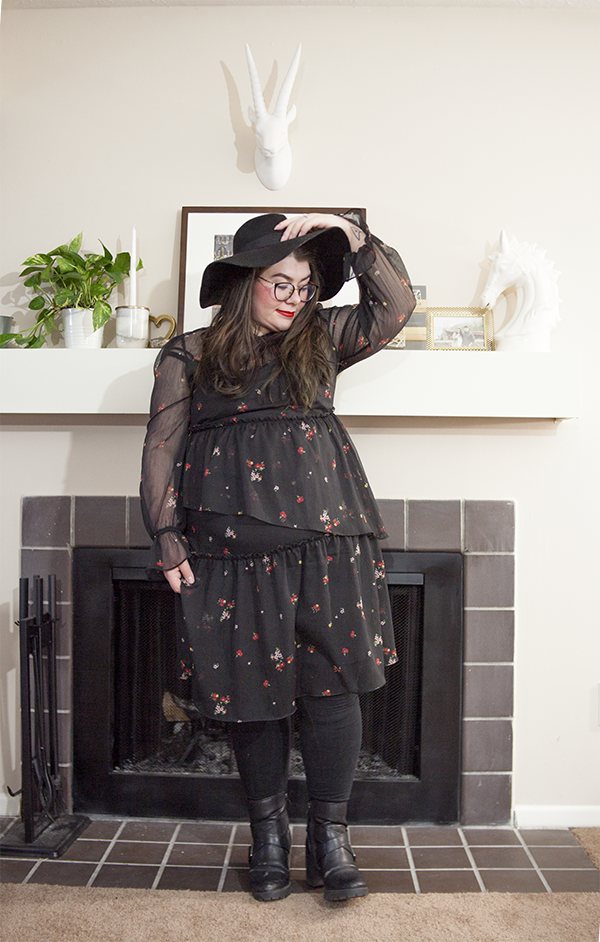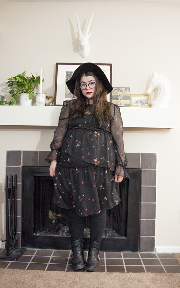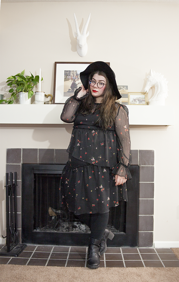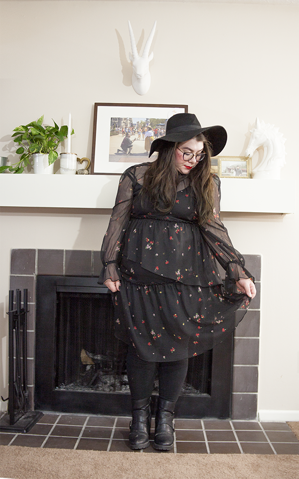 This dress was a birthday gift from Tony to me and I adore it. He saw me looking at it in the store because I love the micro floral print and the sleeves and knew it was my style. I decided to style it in a late winter witch way. But, I can totally see it being styled in a sweet romantic way.