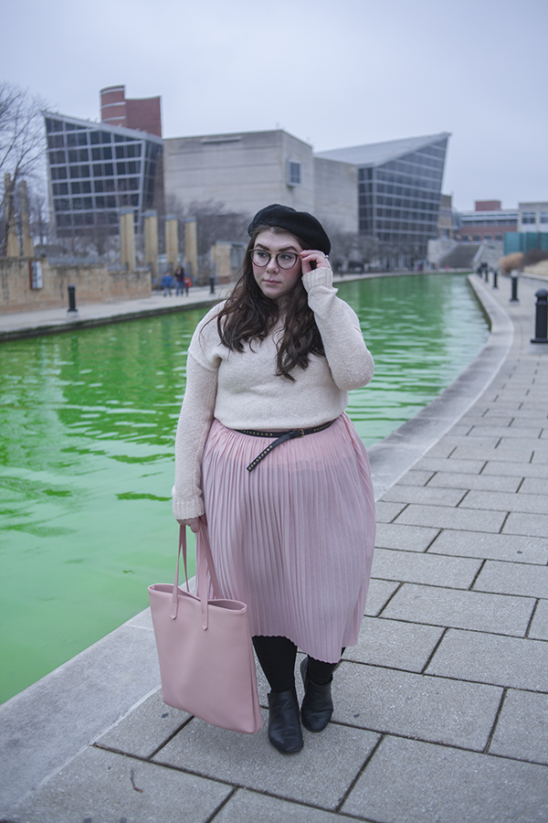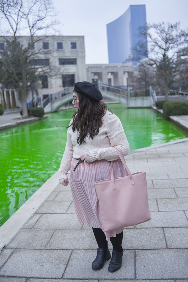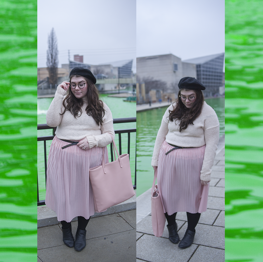 I don't think I've ever been the kind of person who hated pink. Okay, maybe in everyone's emo days they claimed they didn't like it, but I really do like pastel shades of pink. Millennial pink (ugh) has to be the most gorgeous pink color I've ever seen and I truly love it. This skirt, which is a few years old at this point, is a well loved piece in my wardrobe--long enough for work, flattering cut, it's pleated--it's perfect for me. The only issue I have with it is that it's thin, so a slip is necessary. I paired the skirt with a neutral sweater to not compete with the pink skirt, and added tights because it is still chilly out there.
