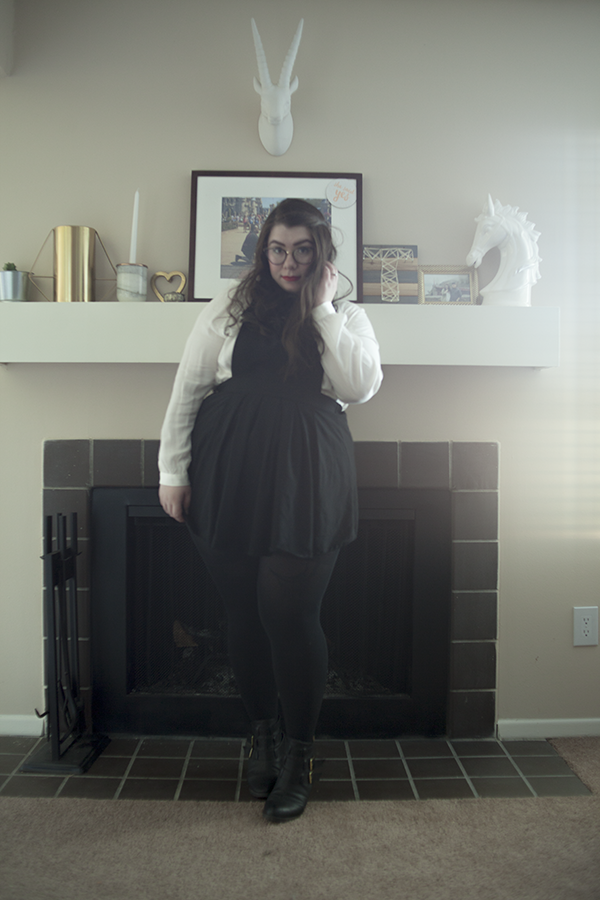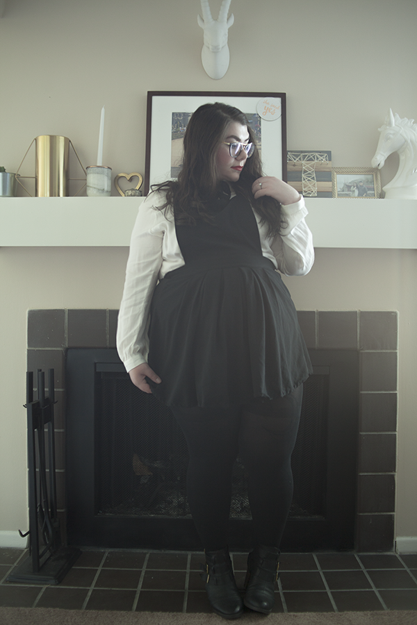 I love the look of layering a super feminine top under these kinds of pinafores, so I added this Peter Pan collared blouse and added tights and heeled boots. I love this feminine look, but I'm still kinda iffy about pinafores as a whole on me. I'll have to style them a few more before I give it yay or nay.
