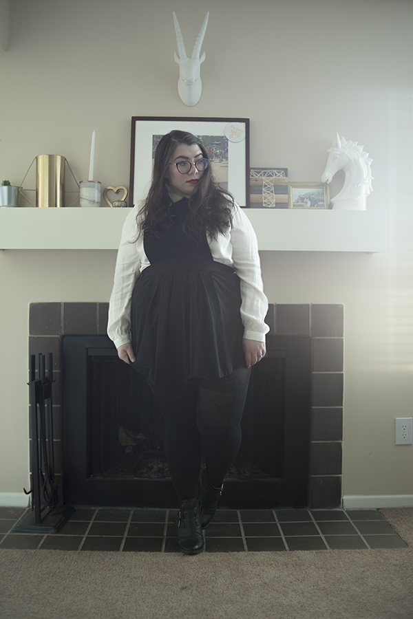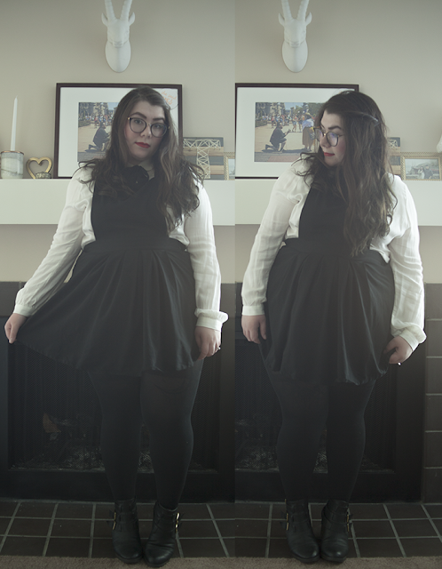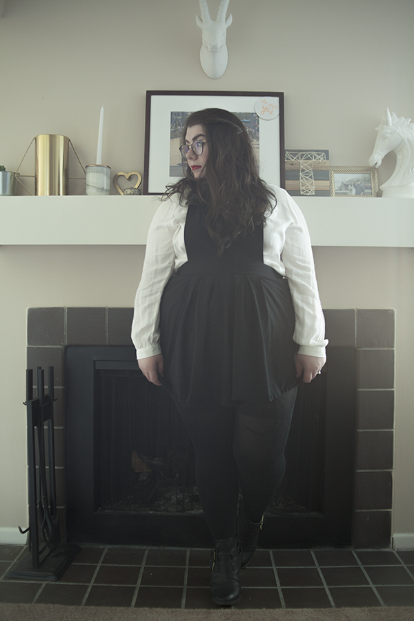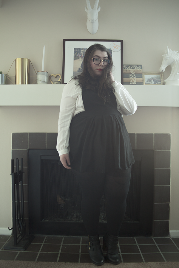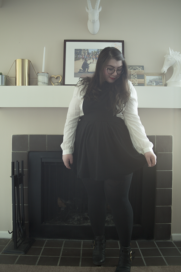 I don't think this is the most perfect pinafore I could have ever gotten, I think the panel in the front is too narrow, and the skirt is too short, but I do love the look of it. I've been looking for pinafores for what feels like forever now, because I really like the look, but it's hard finding one that isn't overall style. Some people look great in overalls, I am not one of them.