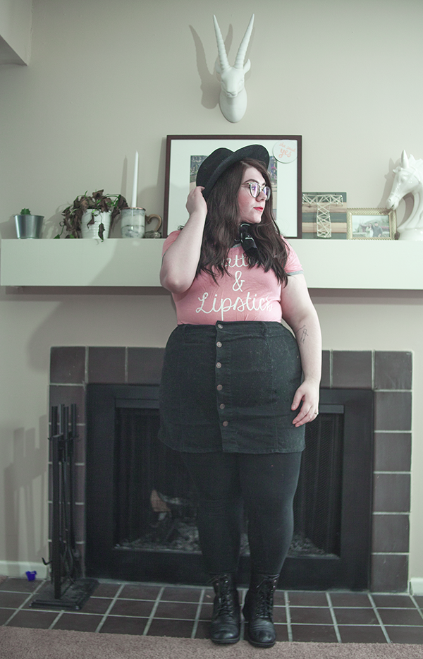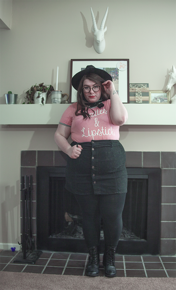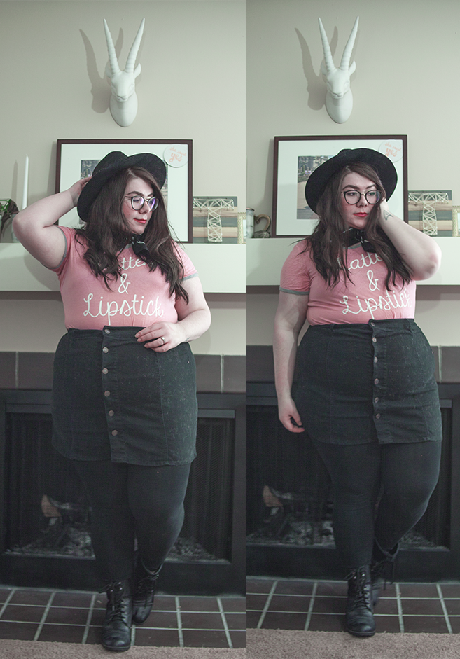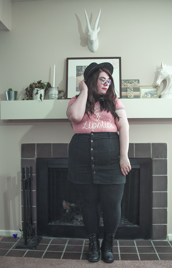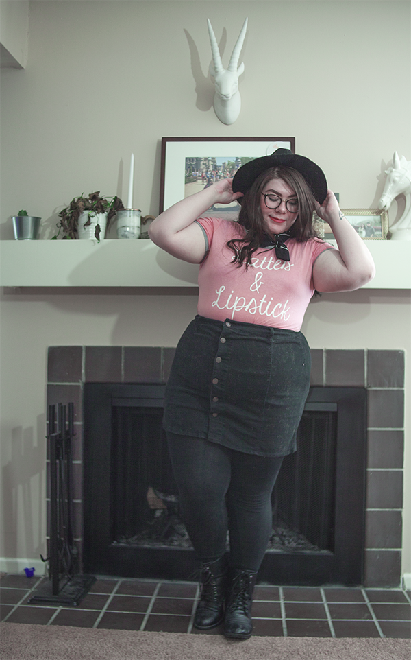 I've had this tee for a long while, and I've worn on it on here before, but on this chilly Sunday, I wanted to be comfy in this errand filled day, so I donned it again, this time, skirt in tow. With a wide brim hat (because duh), tights, and boots, it's cool girl mixed with girl who doesn't know how to look at a camera. Guess what girl that's referring to.