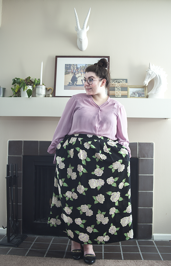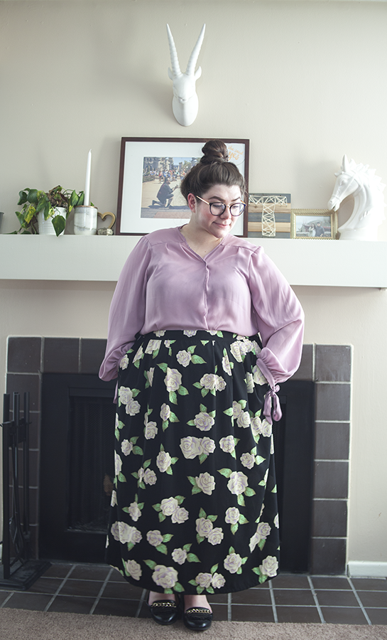 Long skirts like this are fantastic for the office, so I played with the hint of purple in the flowers on the skirt, and matched a blouse of a similar hue. I added loafers for comfort and chicness, and there you have a comfortable and chic office look!